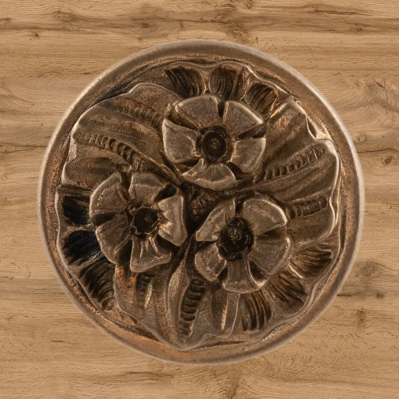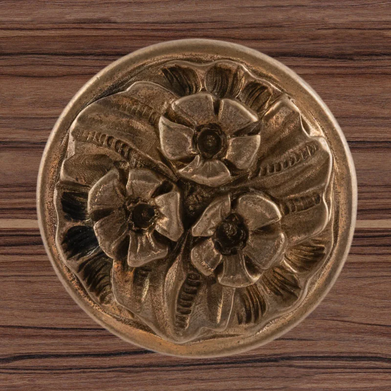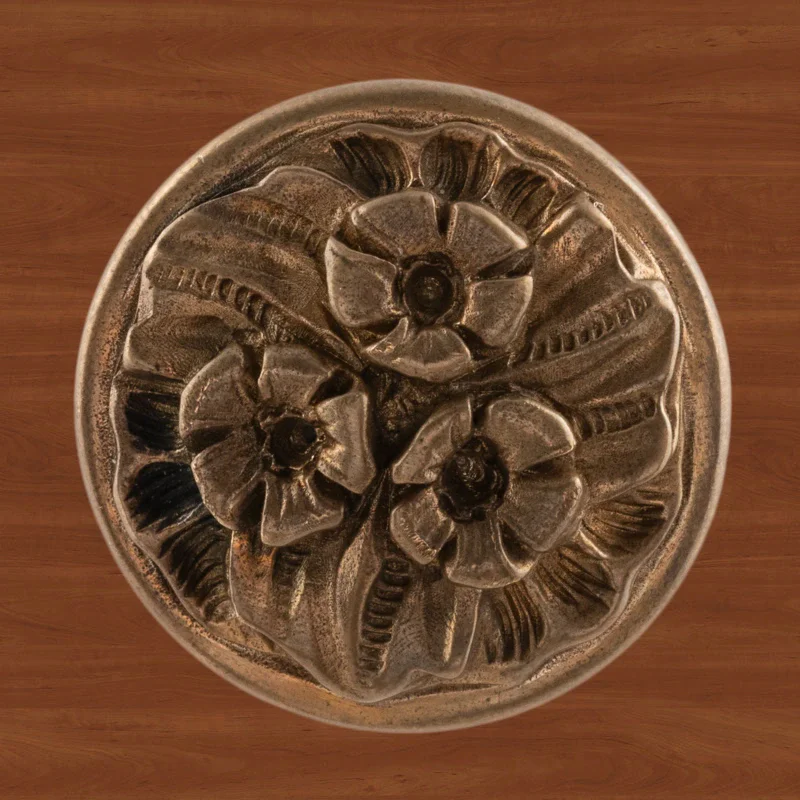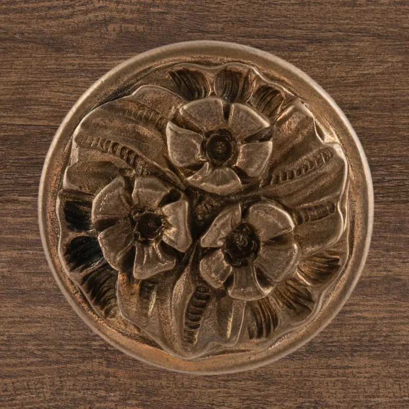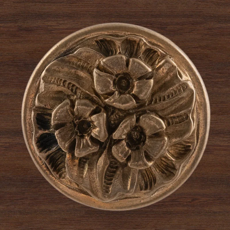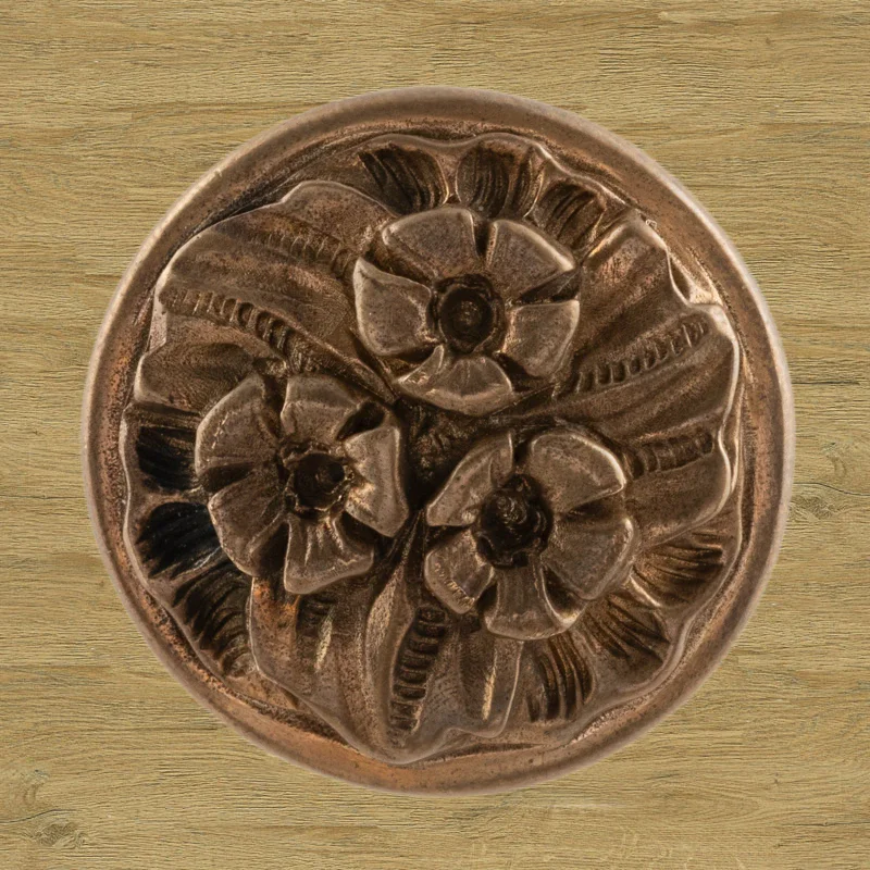 Мастерская «Калежа» изготавливает мебельную фурнитуру в стиле модерн. Ручка-кнопка Ф3037 выполнена из латуни. Чтобы получить три цветка и другие декоративные элементы, специалисты использовали бронзовое литье. Ручка предотвращает движение дверцы шкафа, надежно удерживая ее. Наши мастера создают подобные работы в течение трех недель. Возможно использование эскизов заказчиков.
