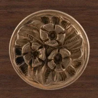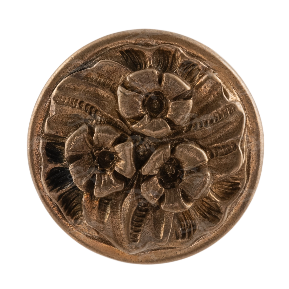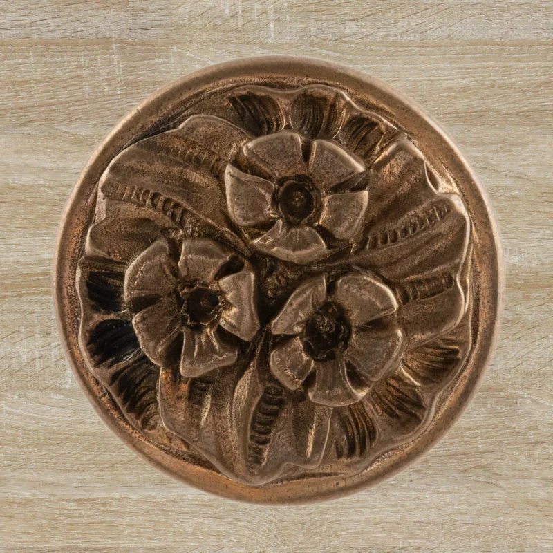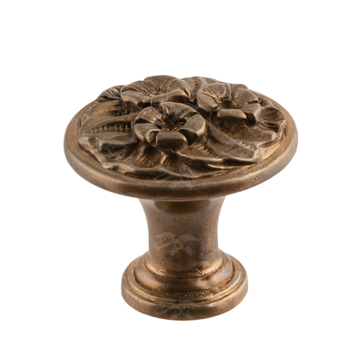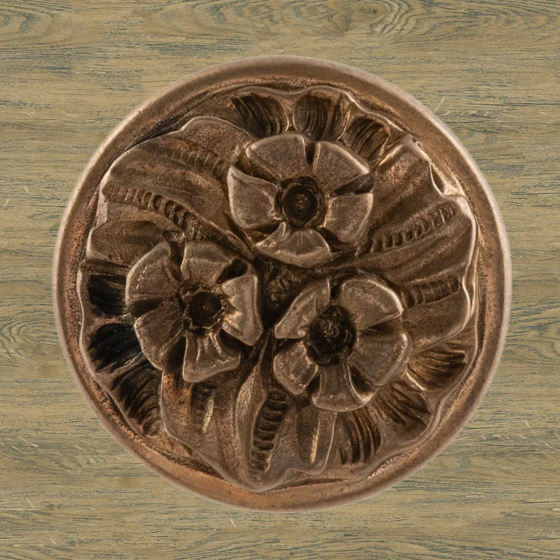 Мастерская «Калежа» изготавливает мебельную фурнитуру в стиле модерн. Ручка-кнопка Ф3037 выполнена из латуни. Чтобы получить три цветка и другие декоративные элементы, специалисты использовали бронзовое литье. Ручка предотвращает движение дверцы шкафа, надежно удерживая ее. Наши мастера создают подобные работы в течение трех недель. Возможно использование эскизов заказчиков.