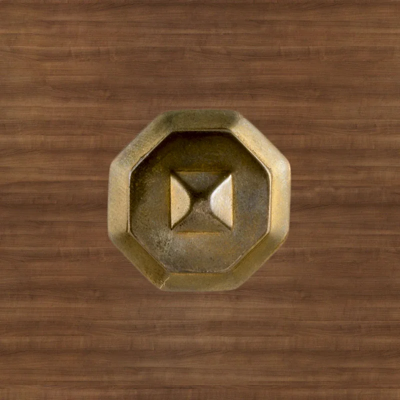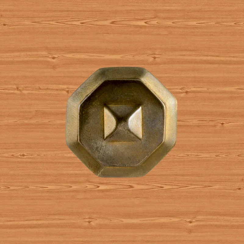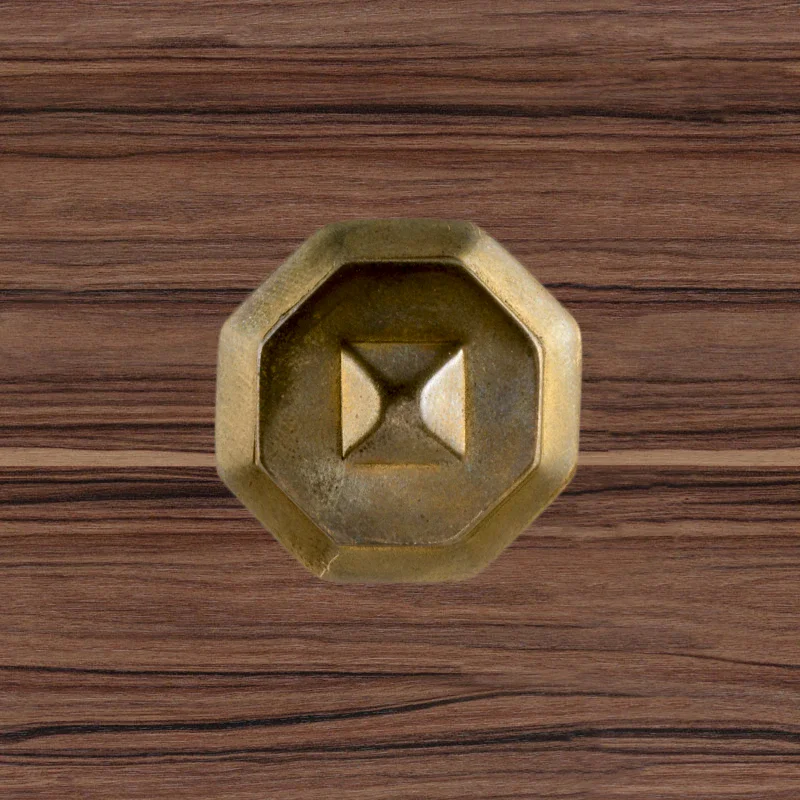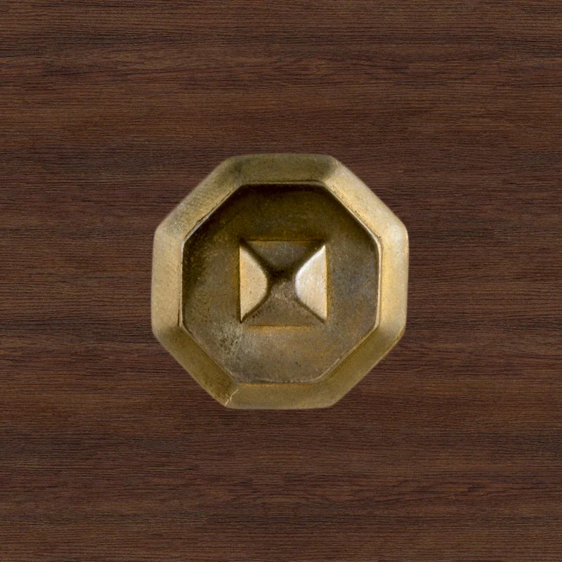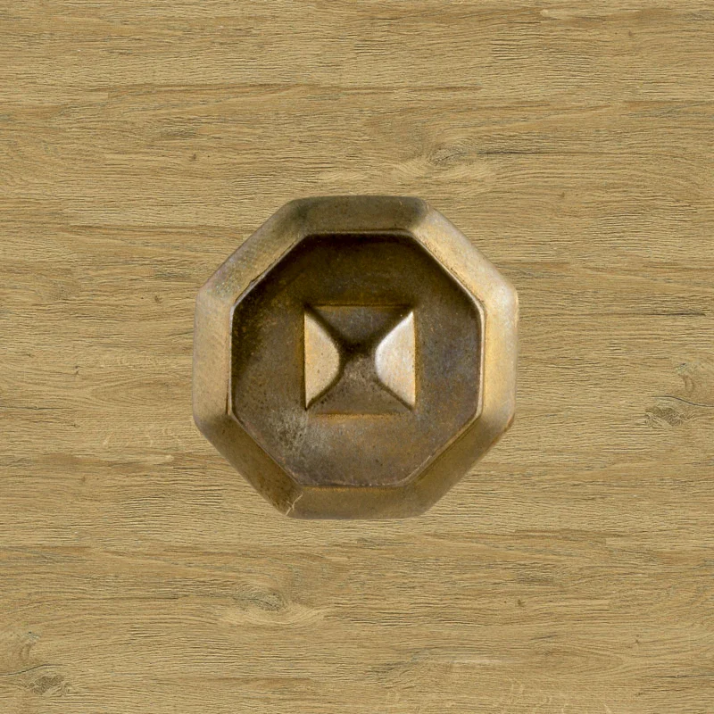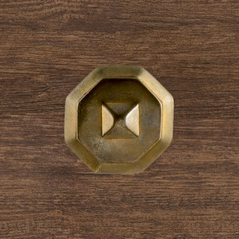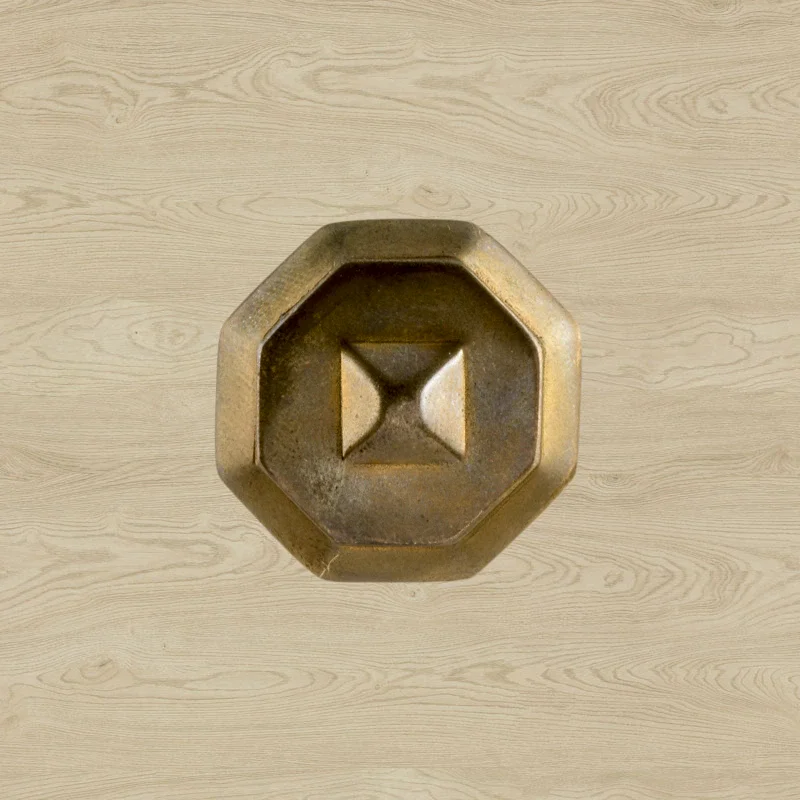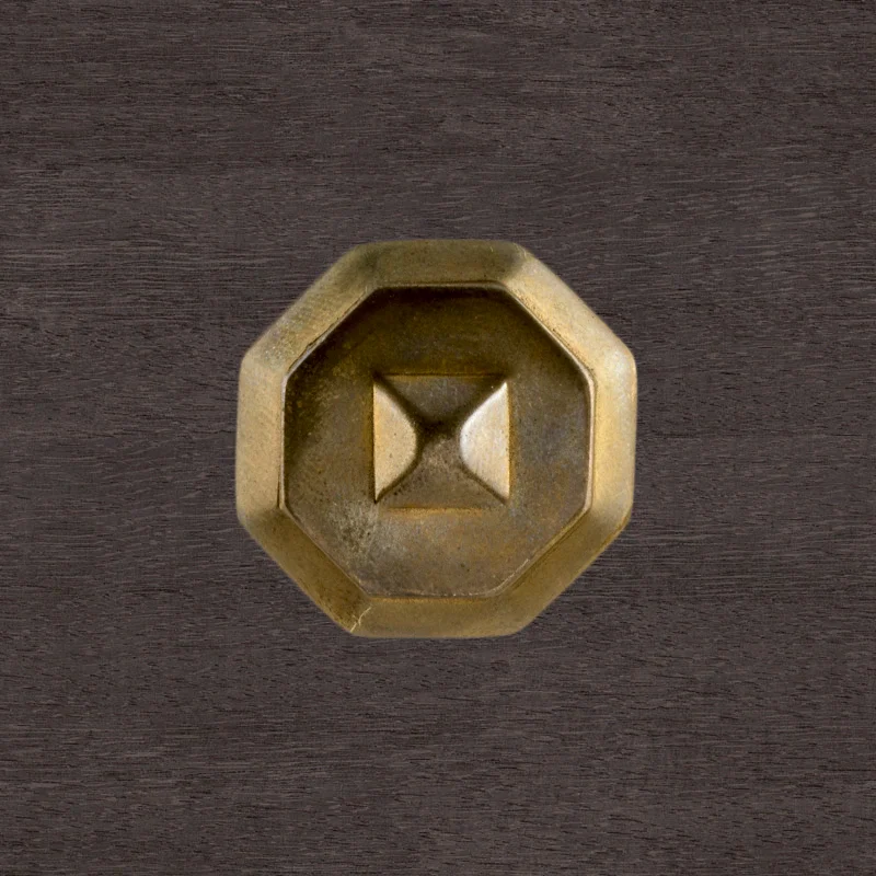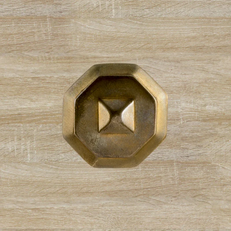 Мастерская «Калежа» создает фурнитуру в стиле модерн. Оригинальная ручка-кнопка Ф3508 изготовлена из латуни. Чтобы получить сложную форму, состоящую из нескольких геометрических фигур, специалисты применяли технологии литья. Для создания эффекта состаренной поверхности использовалось чернение. Можно заменить его золочением, серебрением, никелированием. Для изготовления подобной работы требуется около трех недель.