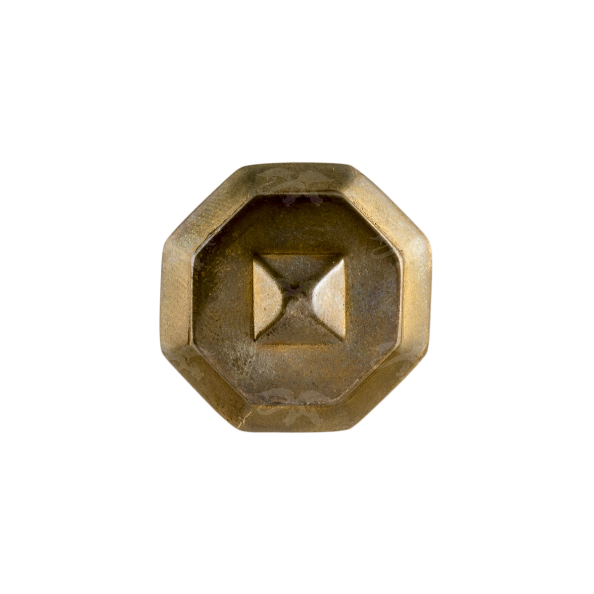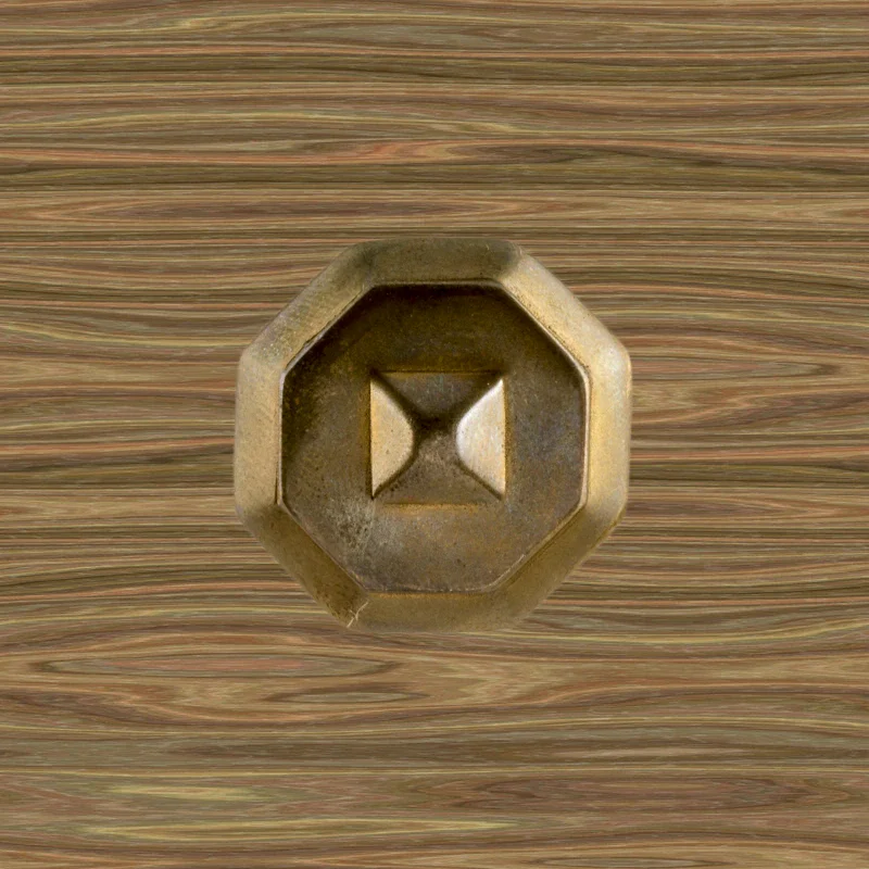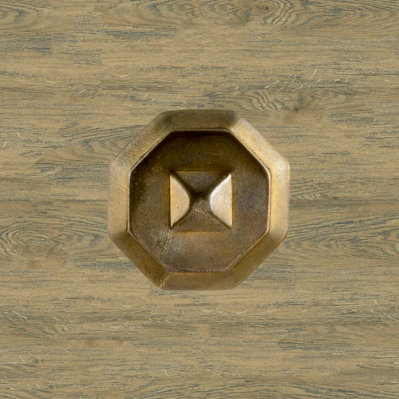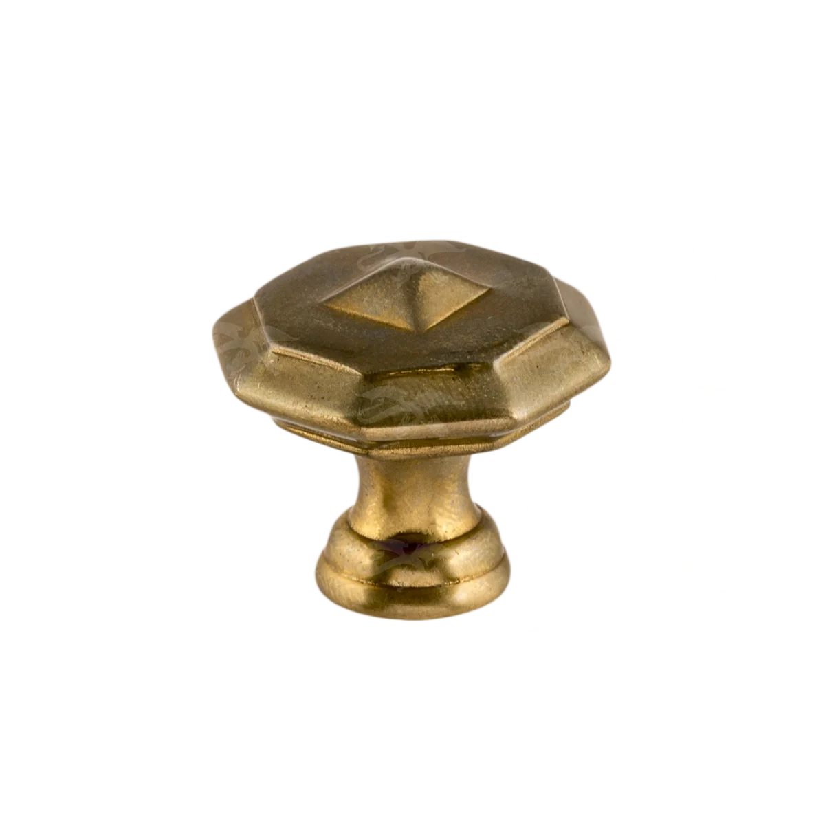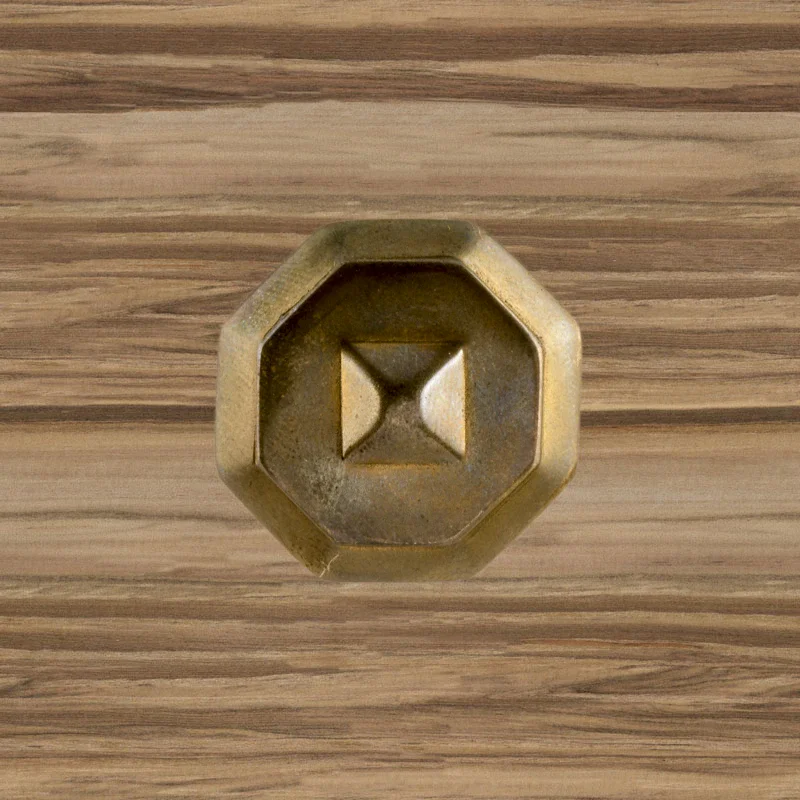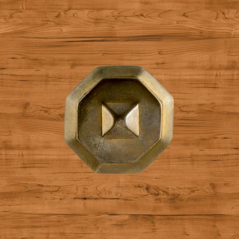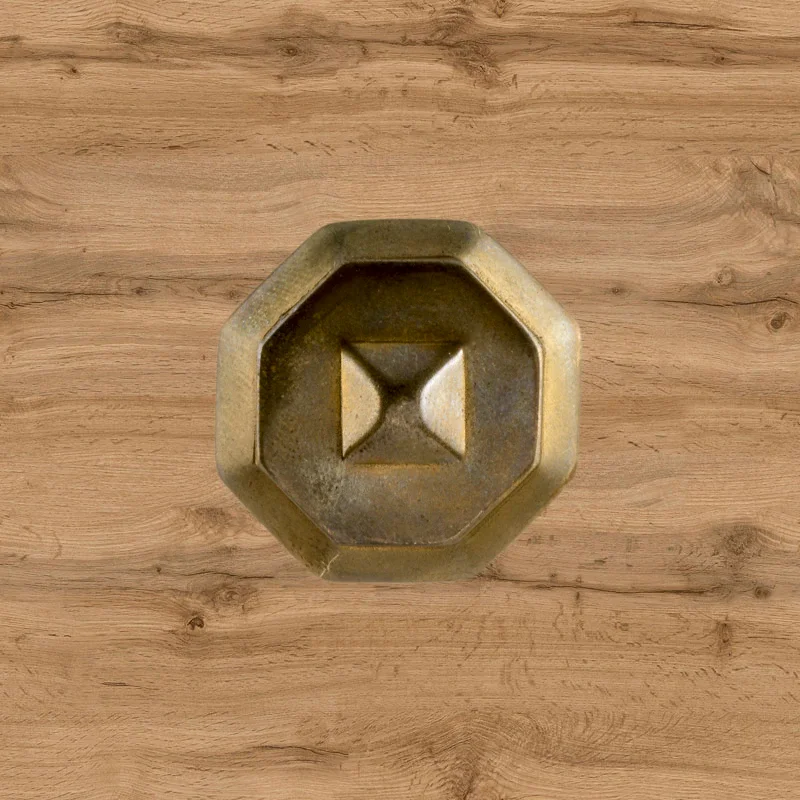 Мастерская «Калежа» создает фурнитуру в стиле модерн. Оригинальная ручка-кнопка Ф3508 изготовлена из латуни. Чтобы получить сложную форму, состоящую из нескольких геометрических фигур, специалисты применяли технологии литья. Для создания эффекта состаренной поверхности использовалось чернение. Можно заменить его золочением, серебрением, никелированием. Для изготовления подобной работы требуется около трех недель.