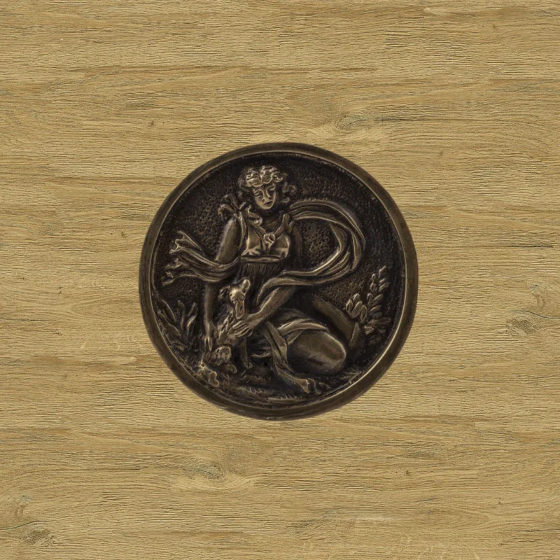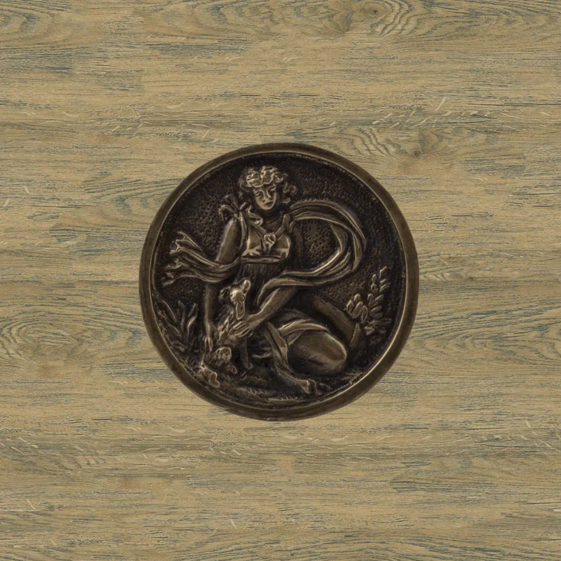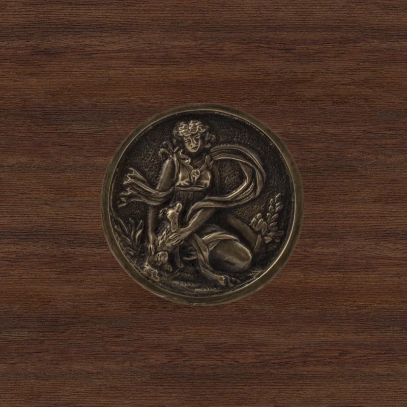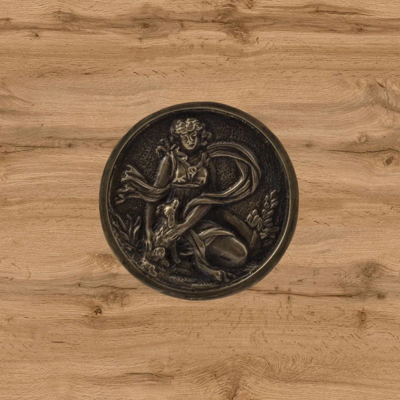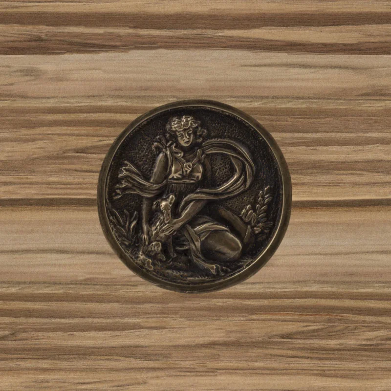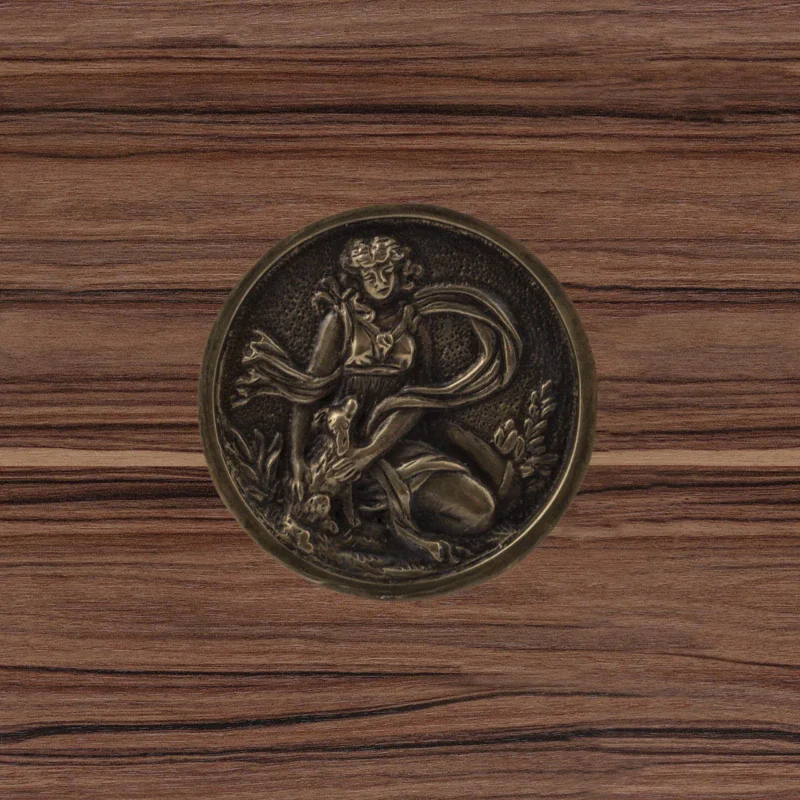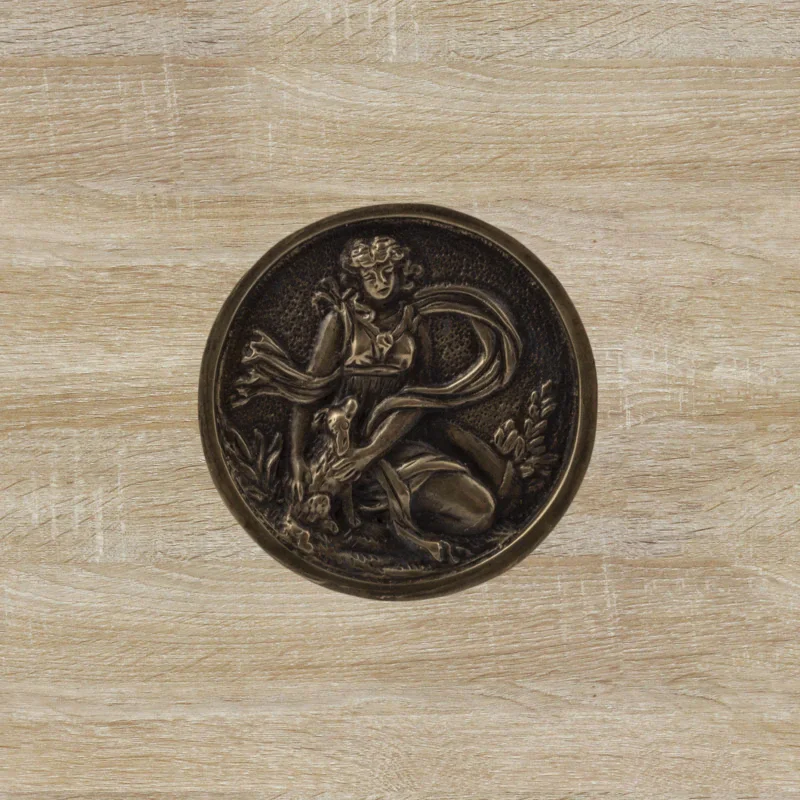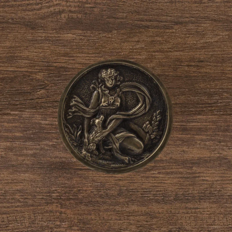 Мастерская «Калежа» выполняет уникальные ручки-кнопки, используя латунь. Оригинальная ручка-кнопка изображает девушку в легком платье, держащую собаку. Работа выполнена по технологии художественного литья. Это изделие подойдет к стилю ампир или классицизм. Наши мастера изготавливают эффектную мебельную фурнитуру по образцу в течение трех недель. Возможно использование ваших эскизов.