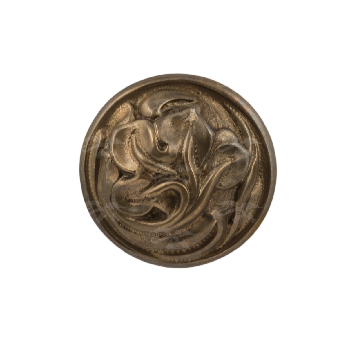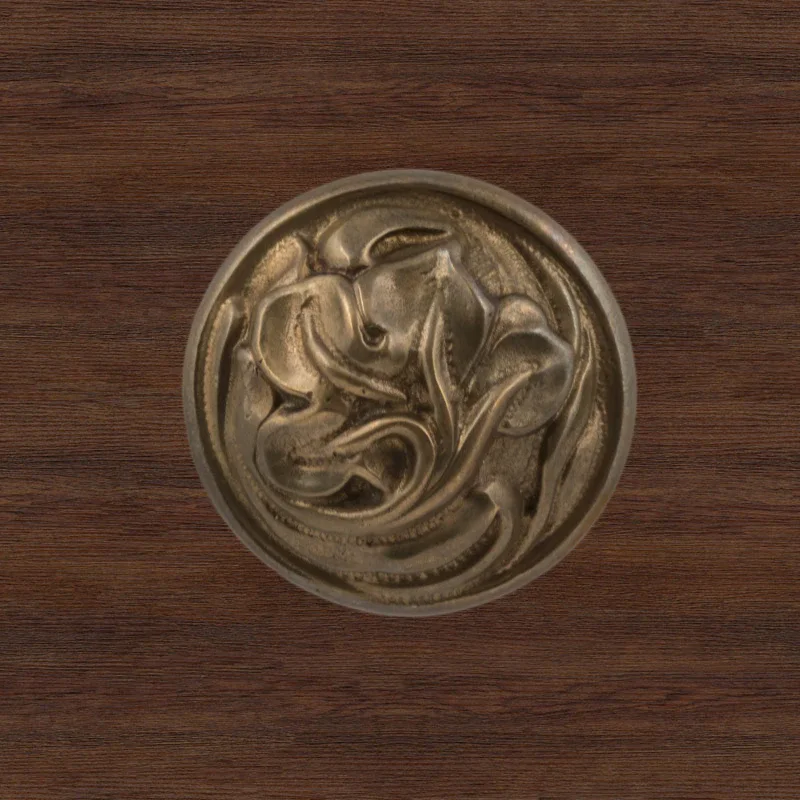Ручка-кнопка в стиле ар-нуво изготовлена из латуни. Выполняя эту задачу, наши мастера применяли бронзовое литье. Для получения оригинальной фурнитуры с растительным узором мы искусственно состарили поверхность. Благодаря этому даже новые шкафы могут имитировать антикварную мебель. Мастерская «Калежа» разрабатывает и реализует подобные проекты в течение трех недель. Дизайн можно дополнить уникальными декоративными элементами.