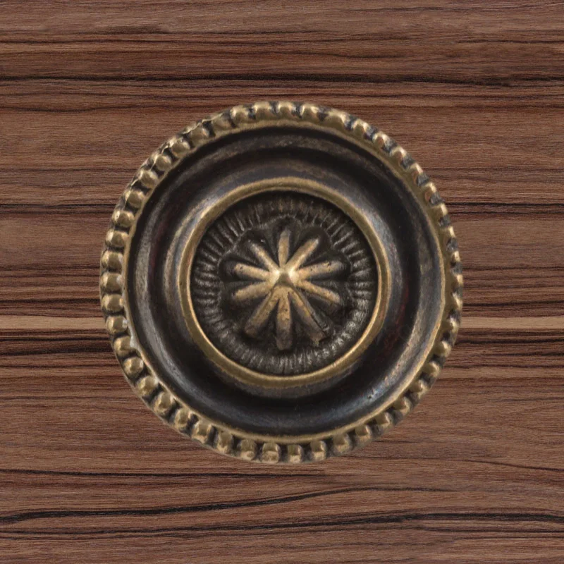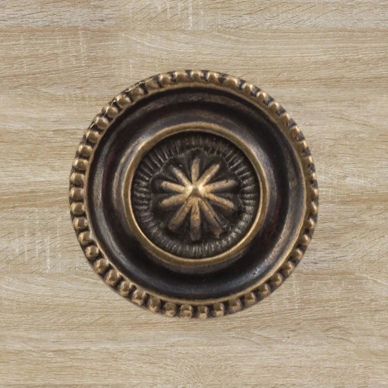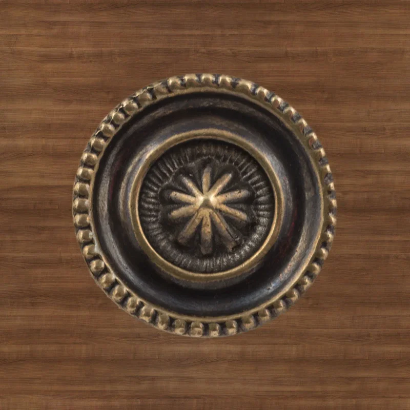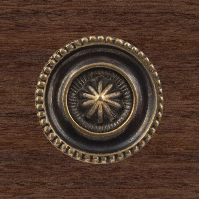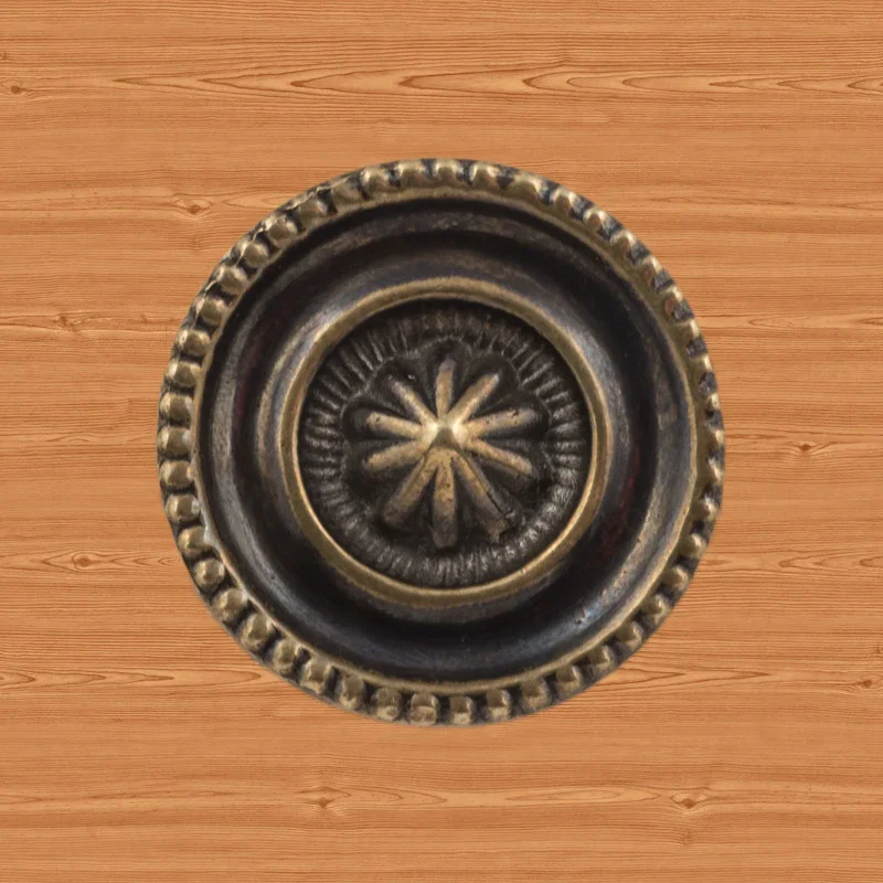 Мастерская «Калежа» выполняет мебельную фурнитуру в стиле модерн. Основная технология производства – бронзовое литье из латуни. В оформлении оригинальной ручки-кнопки можно увидеть растительные мотивы. Чтобы создать имитацию состаренной поверхности, мастера использовали чернение. По вашему заказу подобная работа с уникальными декоративными элементами будет выполнена всего за три недели.
