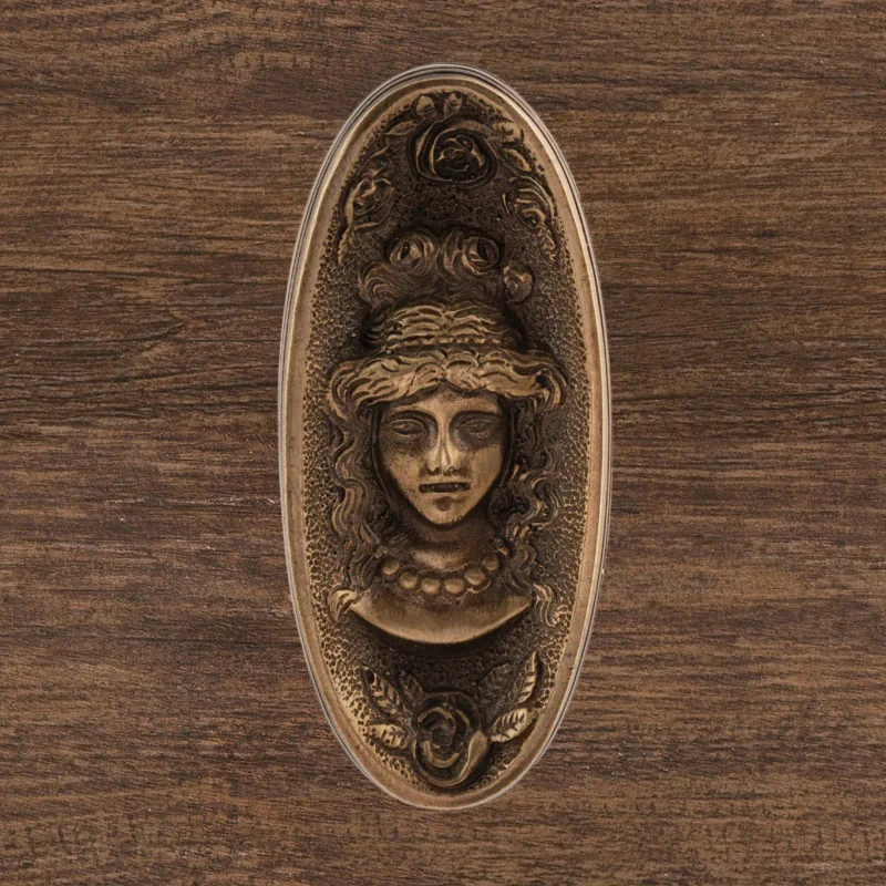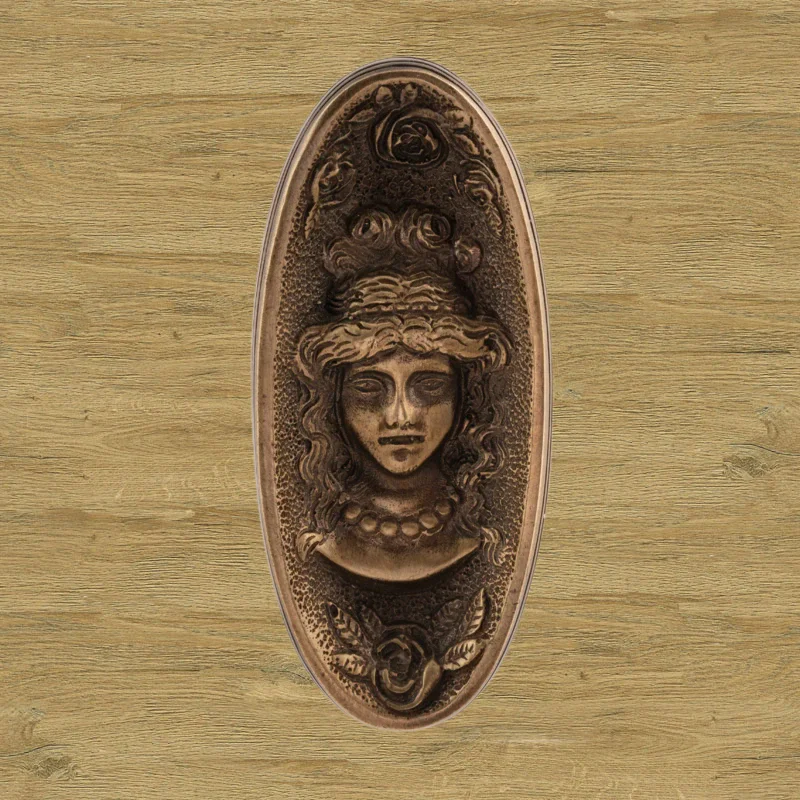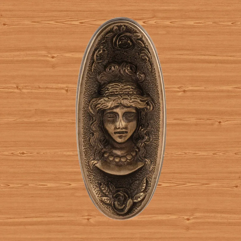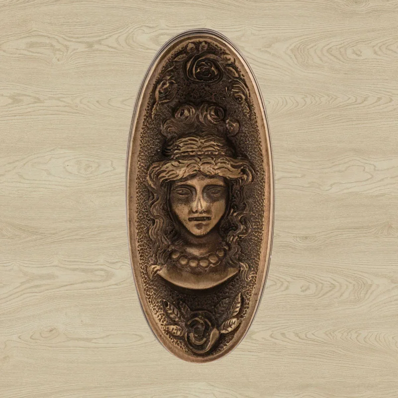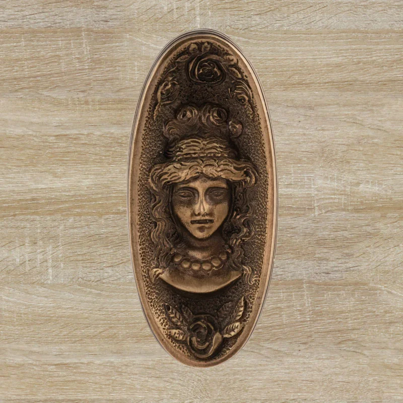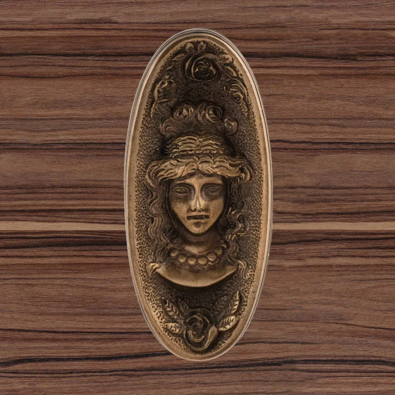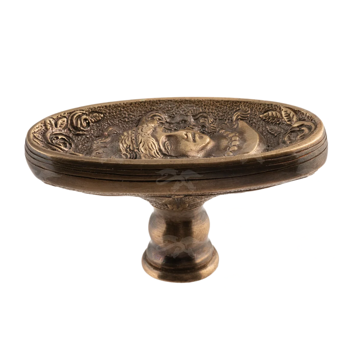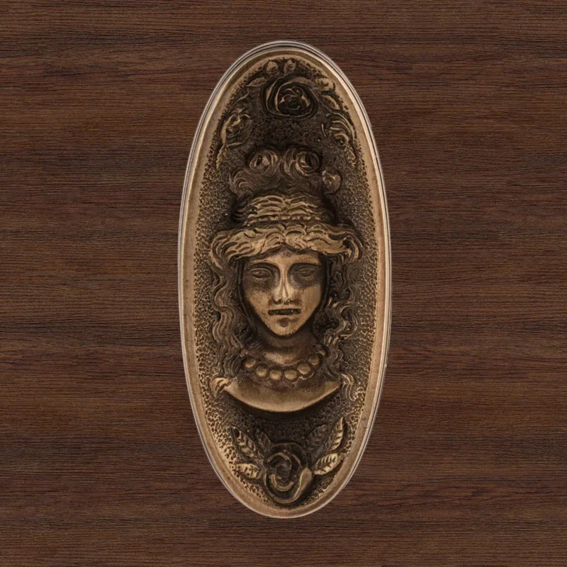 Мастерская «Калежа» изготавливает качественную и разнообразную фурнитуру для любой мебели. Эта ручка-кнопка отлита из латуни. Барельеф в овальном медальоне, сдержанный флористический декор, тщательное соблюдение симметрии –такое сочетание говорит о четком следовании канонам стиля ампир.