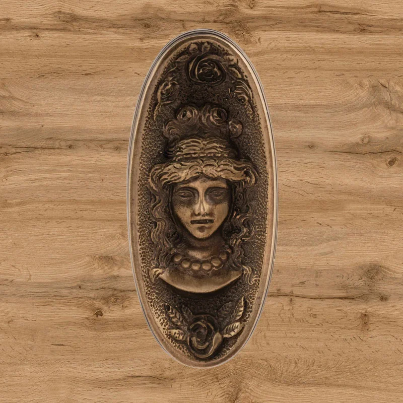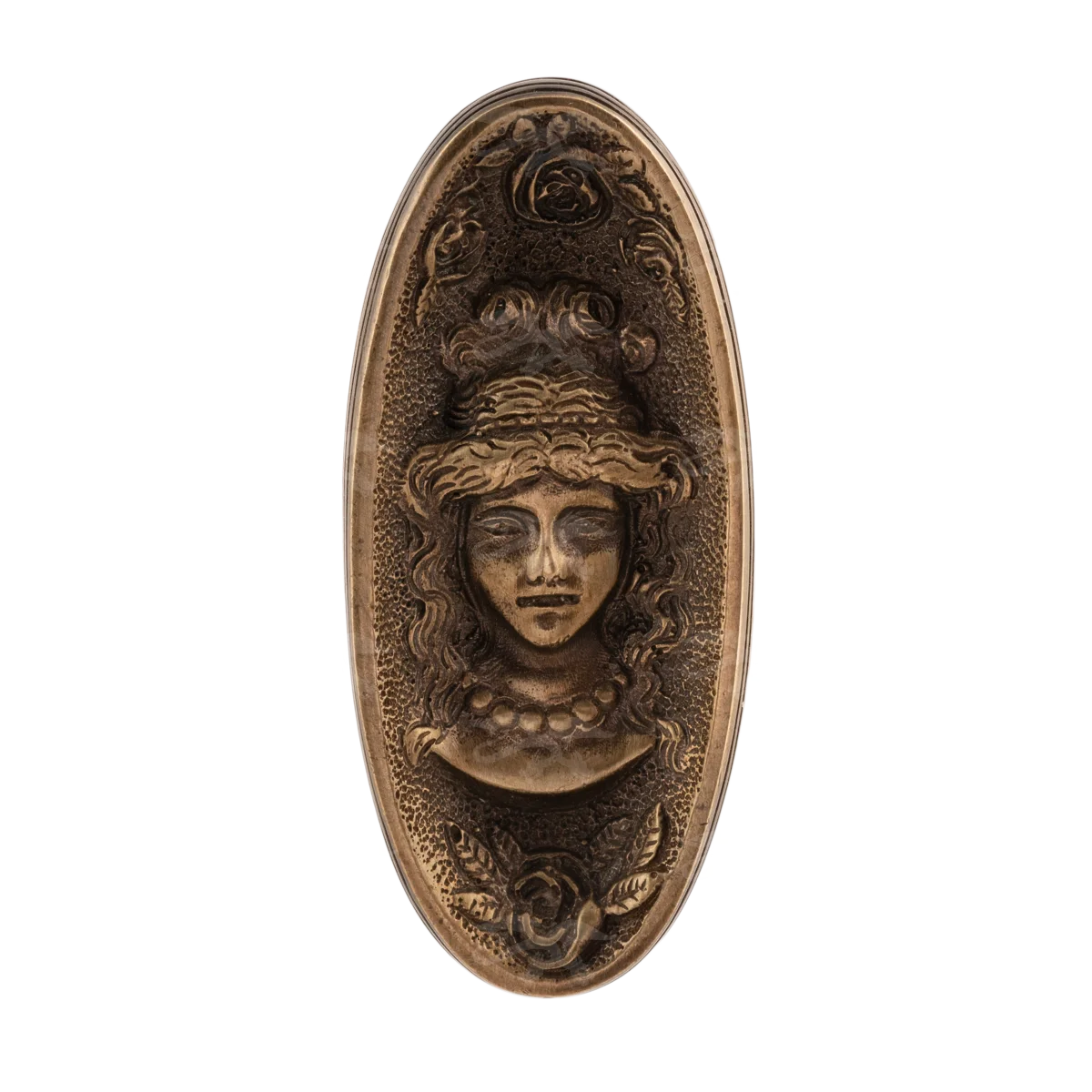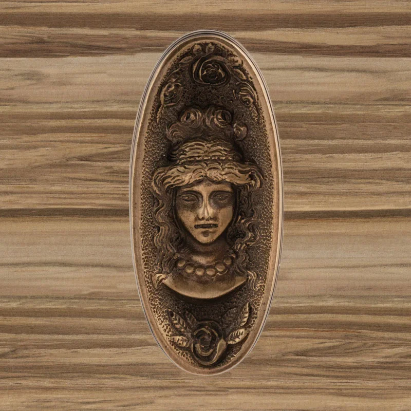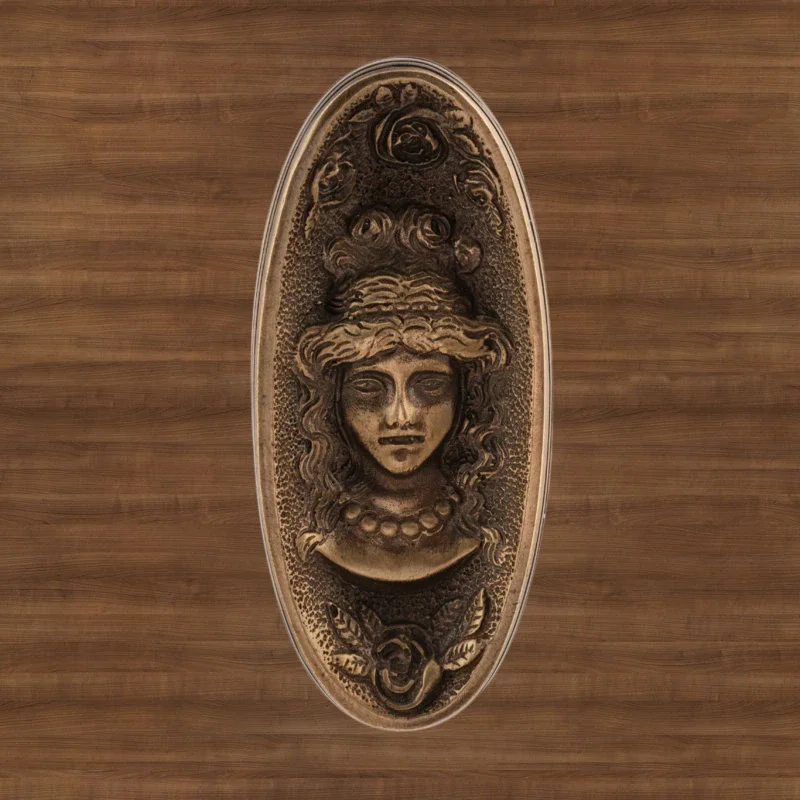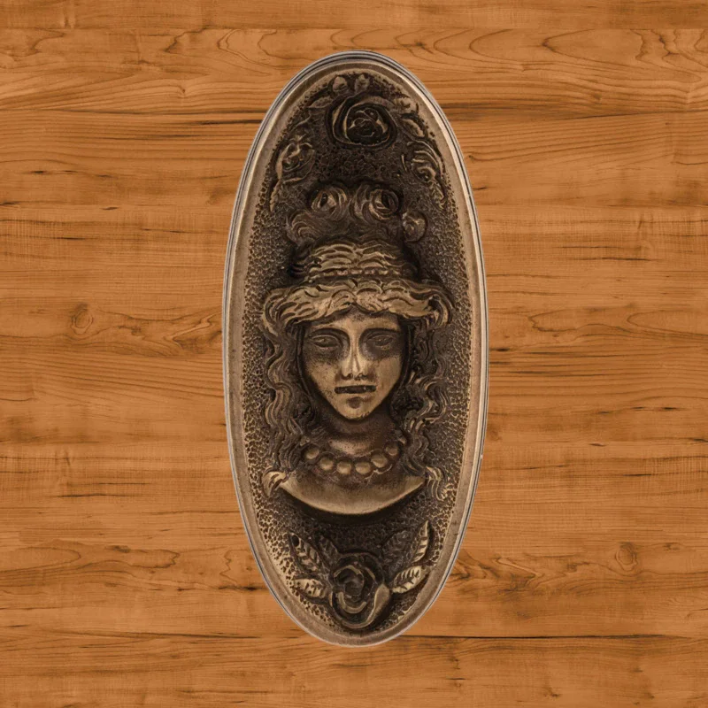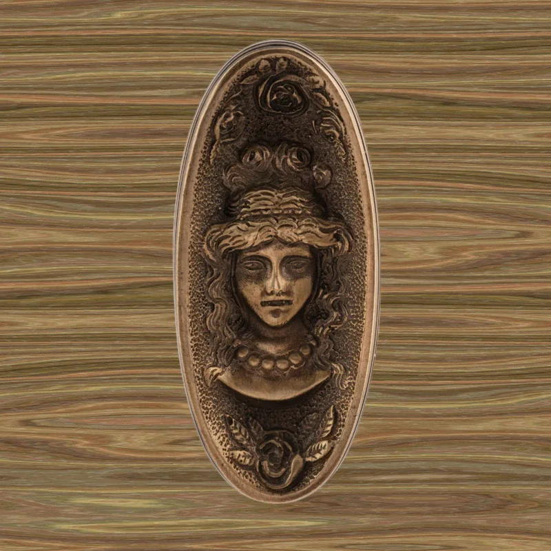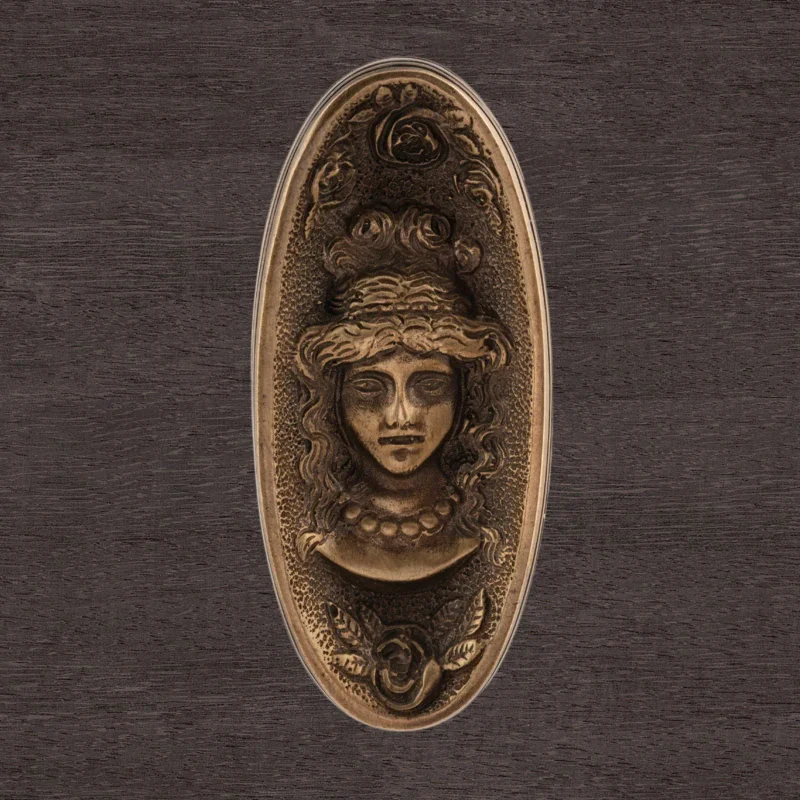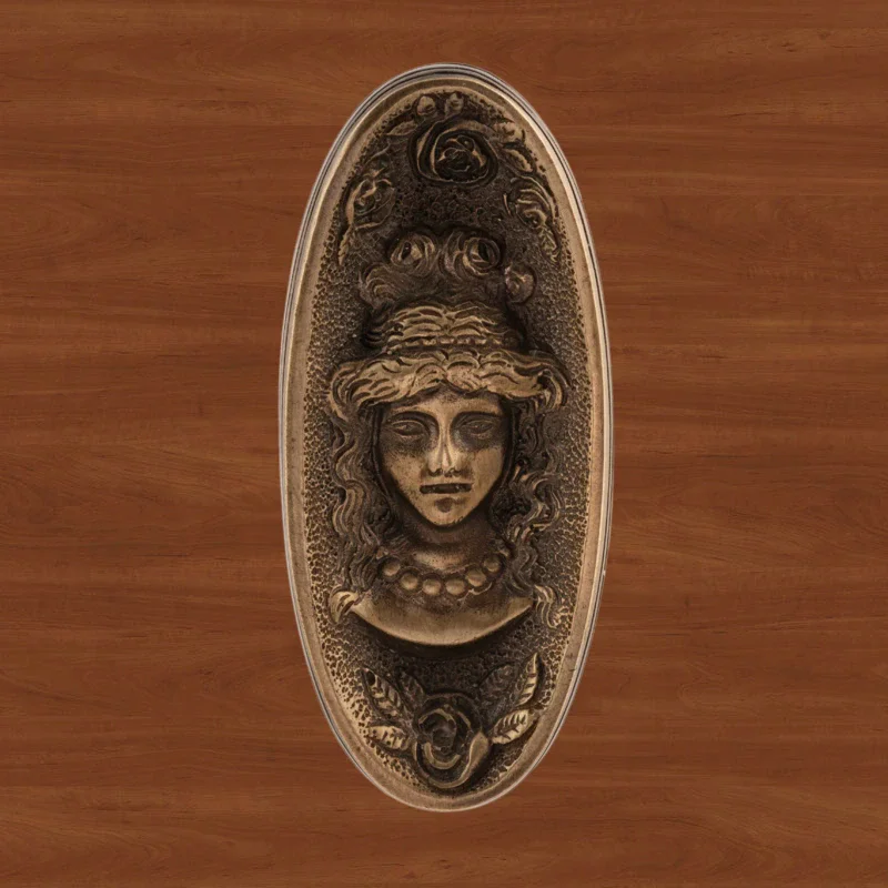 Мастерская «Калежа» изготавливает качественную и разнообразную фурнитуру для любой мебели. Эта ручка-кнопка отлита из латуни. Барельеф в овальном медальоне, сдержанный флористический декор, тщательное соблюдение симметрии –такое сочетание говорит о четком следовании канонам стиля ампир.