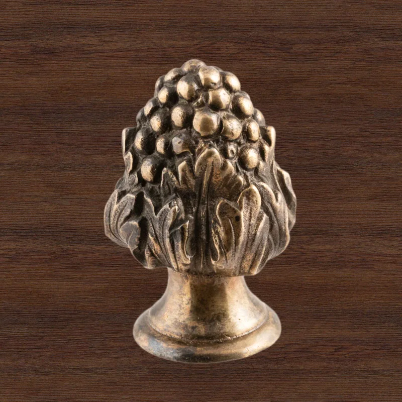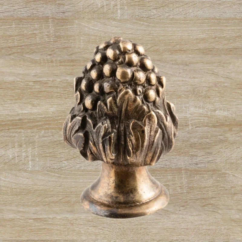 Шишка декоративная изготовлена из латуни. Ее можно использовать в качестве элемента украшения интерьера или ручки-кнопки. Работа выполнена по технологии художественного литья. Для получения эффекта старины специалисты применяли чернение. Мастерская «Калежа» создает подобную классическую фурнитуру всего за три недели. Мы также работаем с эскизами, которые предоставляют заказчики.