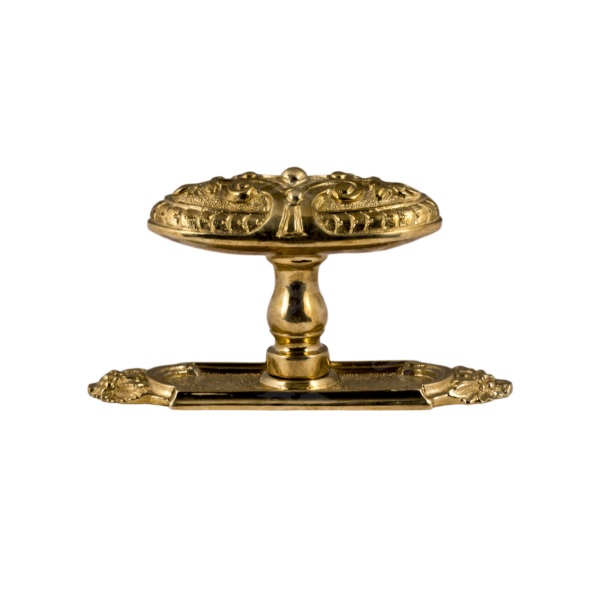 Оконная ручка декорирована элементами в виде скульптурных стилизованных изображений листьев растений. Центральная композиция – завитки Витрувия (ряд волнообразных мотивов). По бокам расположена небольшая гильотировка.