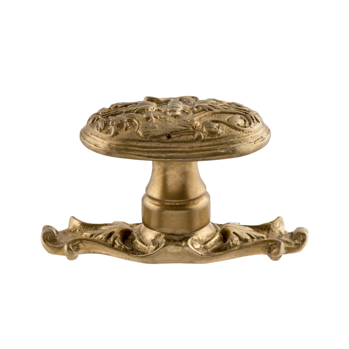 Представленная ручка с накладкой – настоящий шедевр из латуни! Изделие выглядит массивным и основательным, но отличается легкостью при открывании и приятно на ощупь. Кроме того, ручка устойчива к коррозии. В качестве декора специалисты художественно-производственной мастерской «Калежа» выбрали стильные геральдические и растительные орнаменты.