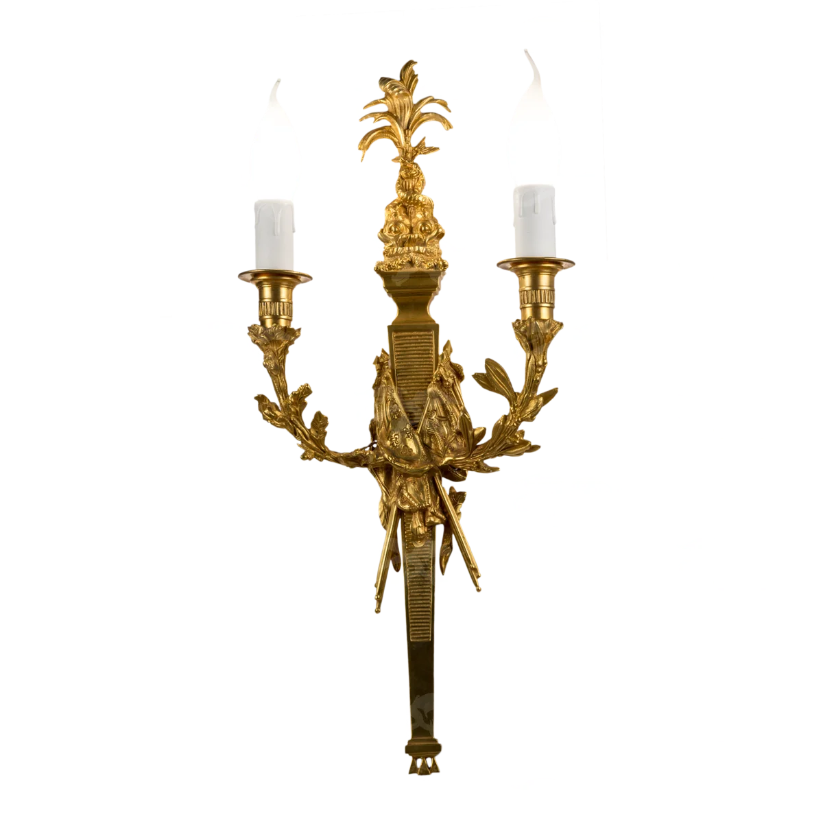 Бра с двумя рожками, выполненное из металлического литья. Особенностью композиции является украшение в виде флагов, симметрично перекрещивающихся в центре изделия. Также светильник украшен растительными мотивами. Заказать изысканные люстры и бра можно в мастерской «Калежа»: укажите интересующий вас артикул, и наши мастера изготовят аналогичный предмет в короткие сроки.