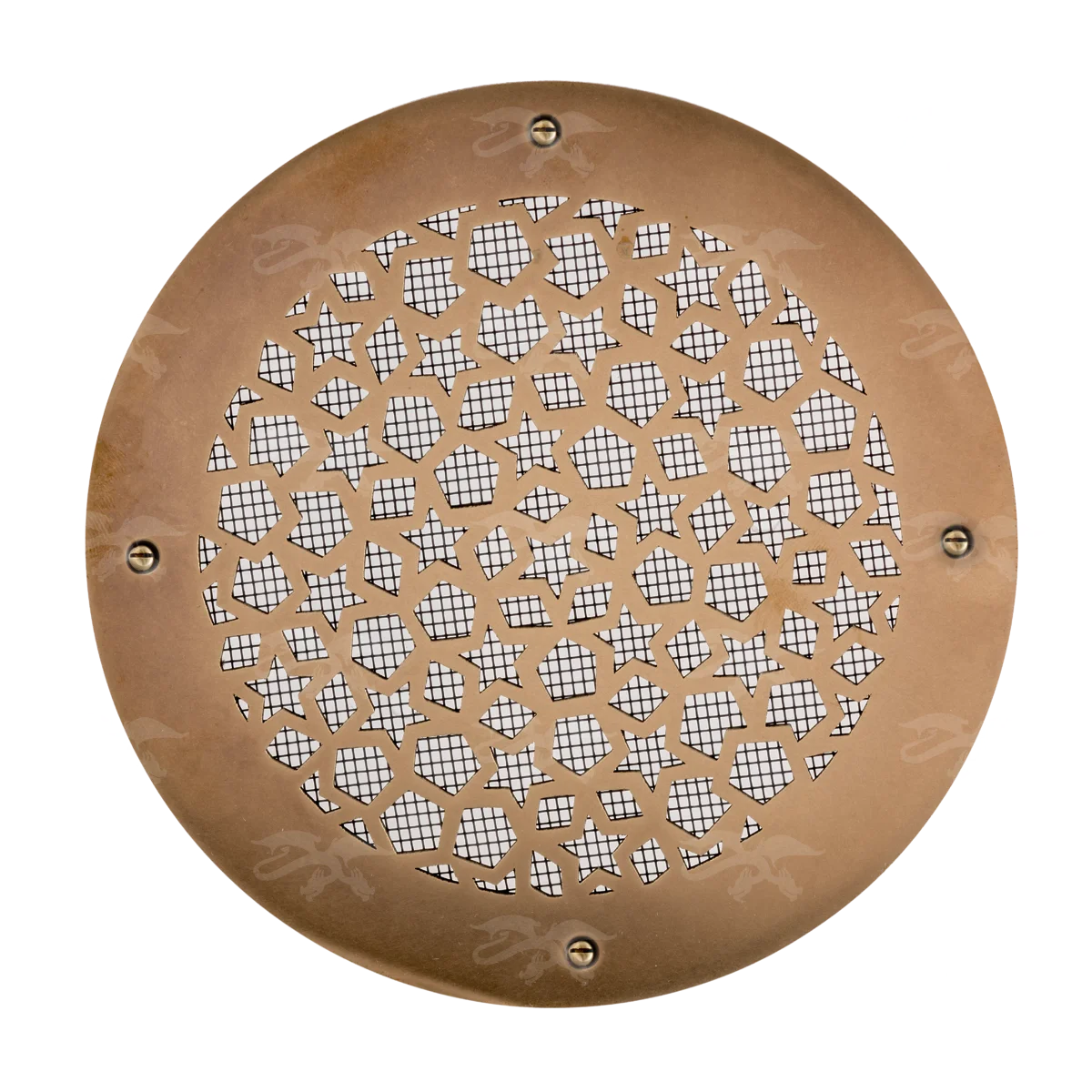 Вентиляционная решетка изготовлена из бронзы методом лазерной резки. Решетка имеет круглую форму. Периферическая часть изделия выполнена в виде широкого ободка. В центре находится узор из звезд, боковые части которых составляют друг с другом пятиугольники. В мастерской «Калежа» также производятся латунные вентиляционные решетки, которые отличаются оригинальным исполнением, высоким качеством и долговечностью.