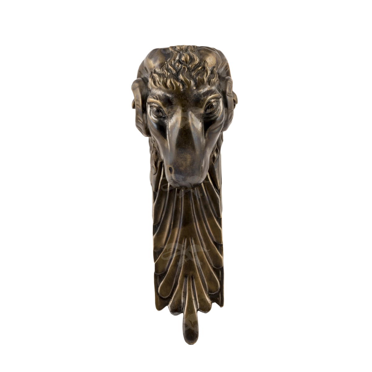 Декоративные элементы становятся финальной точкой при воплощении креативного замысла интерьерного дизайнера. Представленная накладка из латуни – одно из таких решений. Она выполнена в виде головы барана и обладает строгой формой. В дизайне присутствуют искривленные линии и разнообразные завитки. Художественно-производственная мастерская «Калежа» изготовит для вас фурнитуру по этому образцу в течение трех недель.