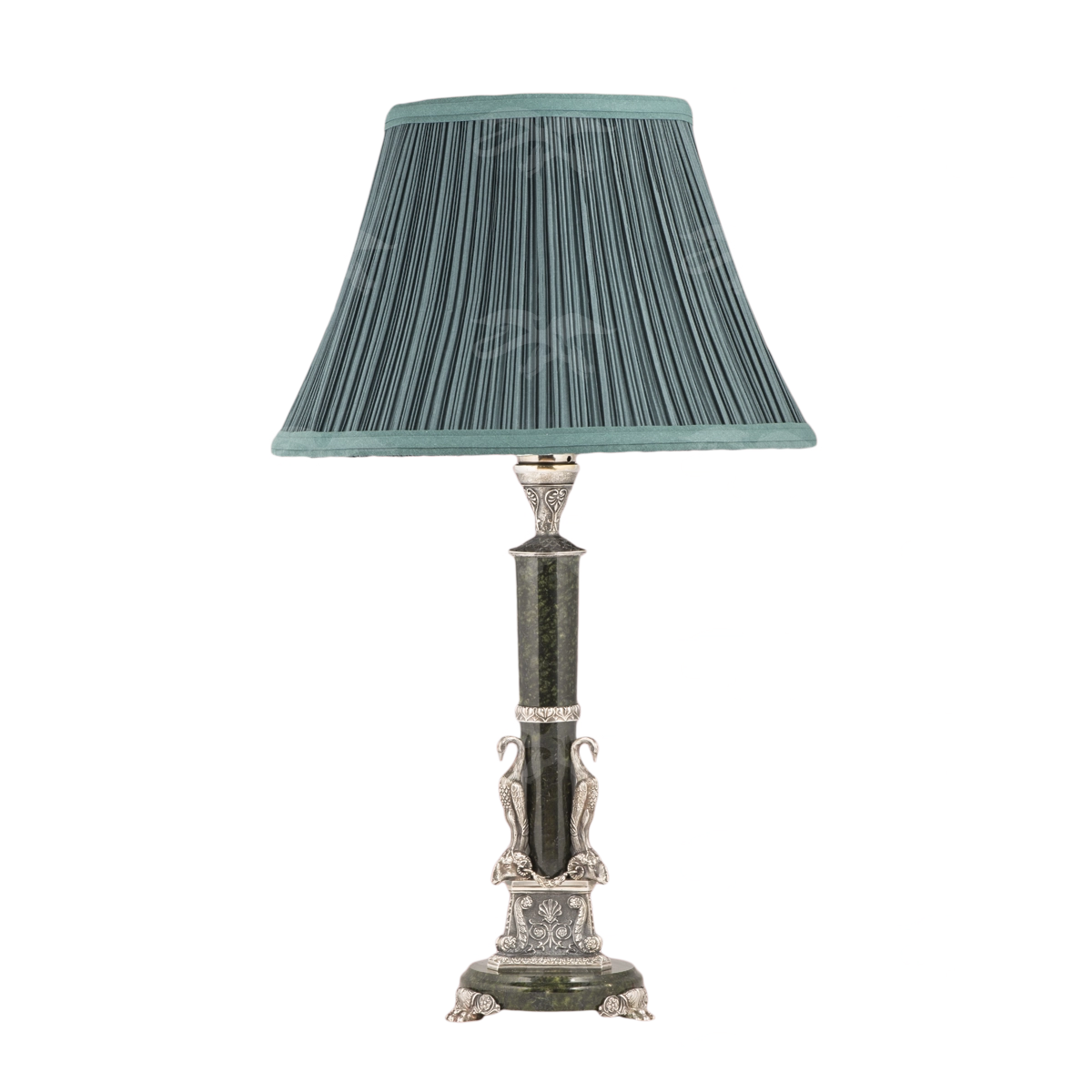 Светильник с абажуром из гофрированного текстиля. Ткань голубого оттенка безупречно сочетается основанием из полированной латуни. Края абажура украшены гладкой окантовкой. Нижняя часть настольной лампы украшена миниатюрными витыми ножками и фигурами животных. В мастерской «Калежа» можно заказать уникальные сувениры и необычные ручки для дверей, а также фурнитуру для антикварной мебели.