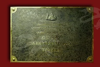 Классическая наружная вывеска выполнена по заказу Московской патриархии. Материалом для этой работы послужила бронза. Вывеска создана в полном соответствии с традициями художественной гравюры. Изображение храма и оформление фоновой поверхности получены с помощью метода травления. Также применялась технология чернения. Подбор шрифтов и соотношение текстовых блоков – профессиональная дизайнерская работа. Заказать производство похожих информационных вывесок можно в мастерской «Калежа». Также в каталоге представлена качественная мебельная фурнитура.