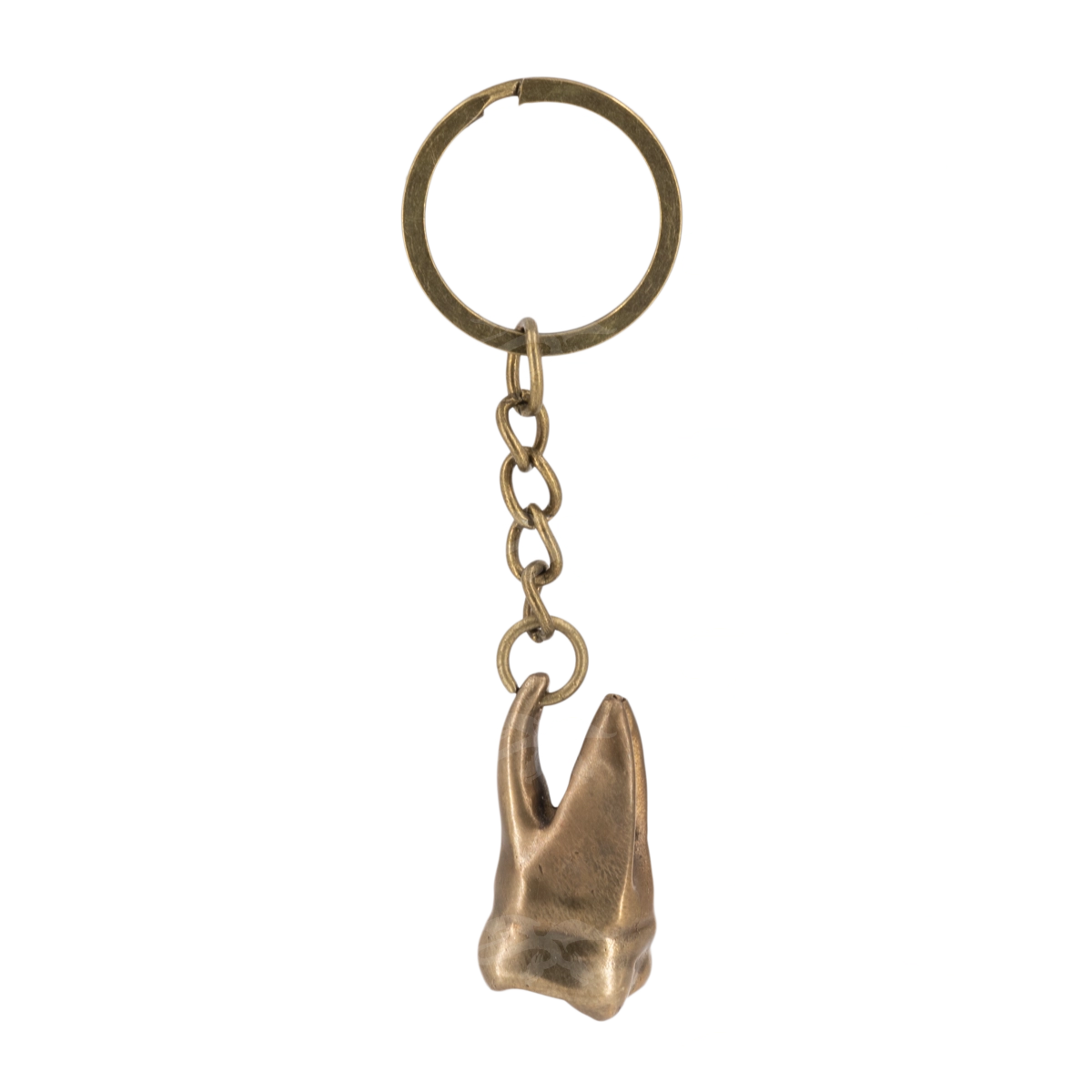Необычный брелок, который станет отличным подарком работнику в сфере стоматологии. Изделие выполнено в виде коренного зуба. Цепочка брелка фиксирована к одному из его корней.