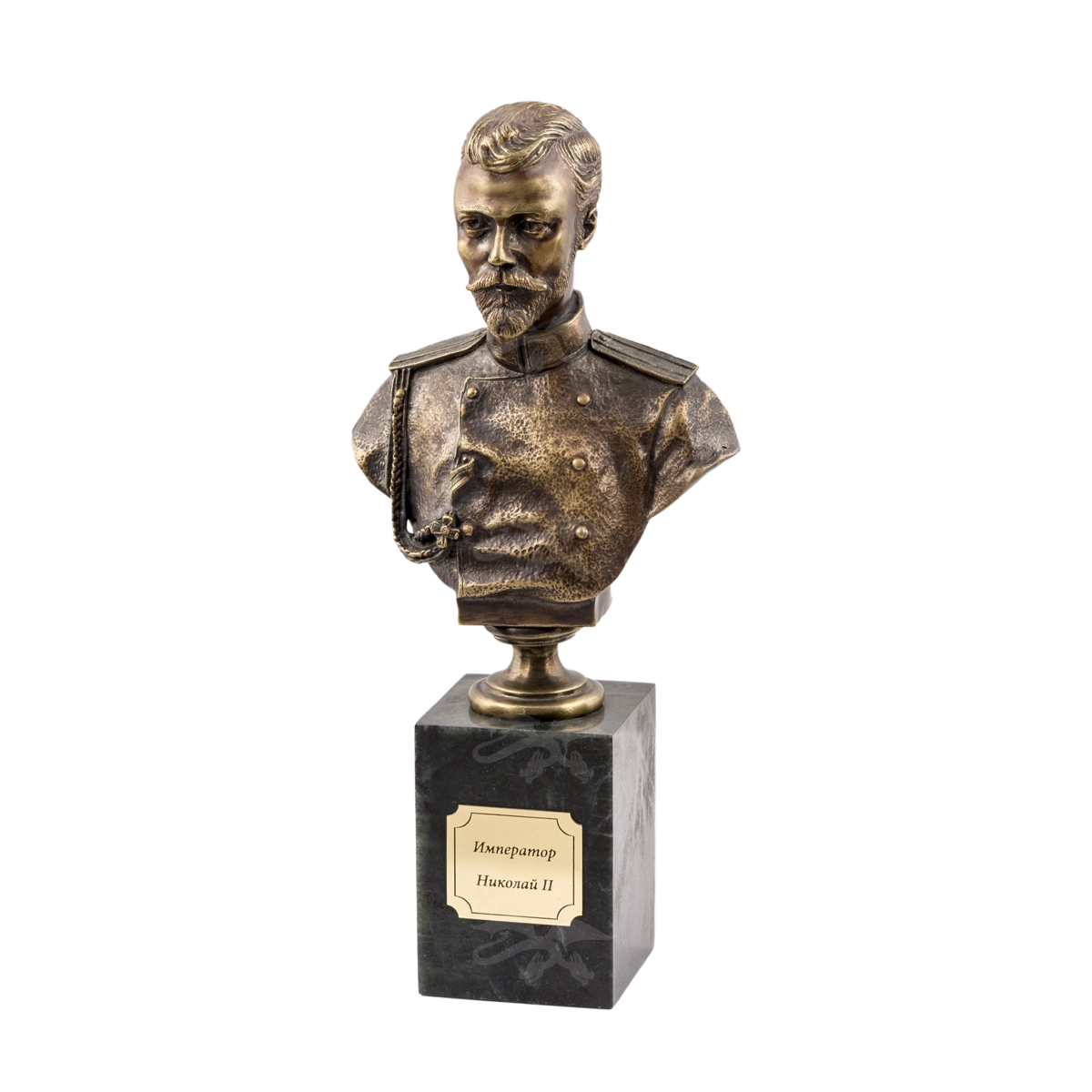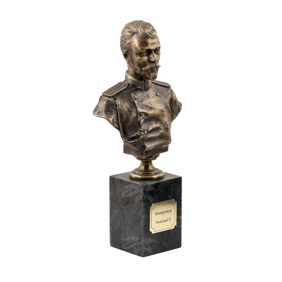 Бюст последнего российского императора выполнен путем «выплавления». Раскаленную латунь мастер залил в заготовленную ранее форму, после чего обработал вручную. Такой подход гарантировал проработку мельчайших деталей композиции. Николай II изображен в кителе полковника, взгляд его задумчив. Основание из серого мрамора и патирование (тонировка) фигурки делают миниатюру похожей на раритет времен конца позапрошлого века.