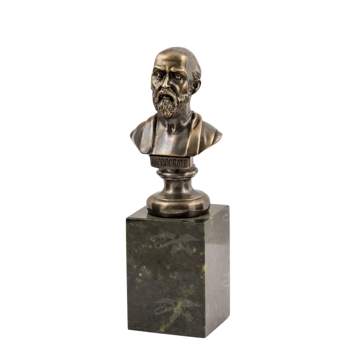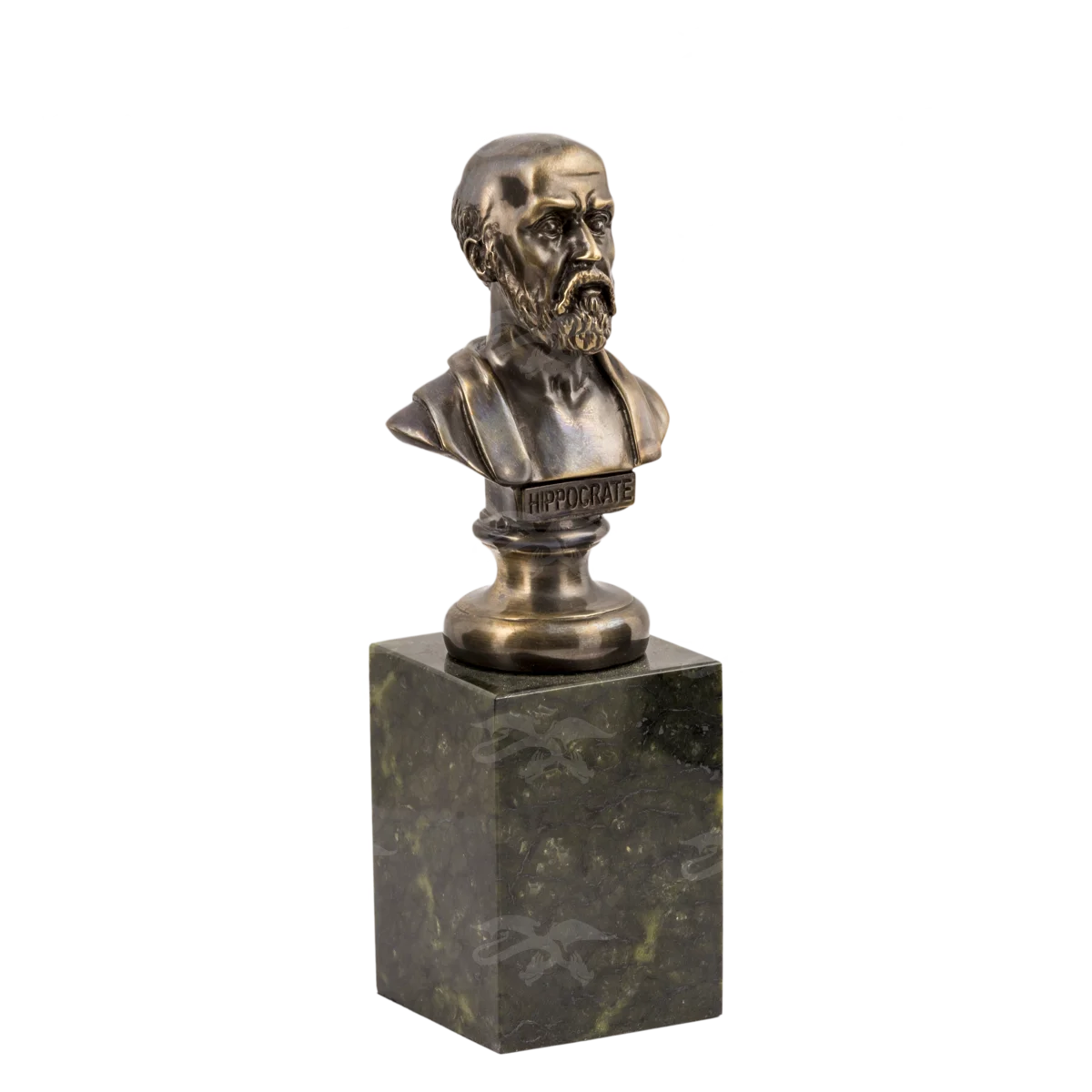Сувенирная скульптура величайшего лекаря древности стала идеальным подарком для медика. Бюст Гиппократа отлит по древней технологии литья из бронзы, только материалом выбрана латунь, металл красивый, не требующий специального ухода. В данном случае мастер после механической обработки провел тонировку поверхности композиции, что добавляет ей солидности. Основанием выбран натуральный темный камень (мрамор).