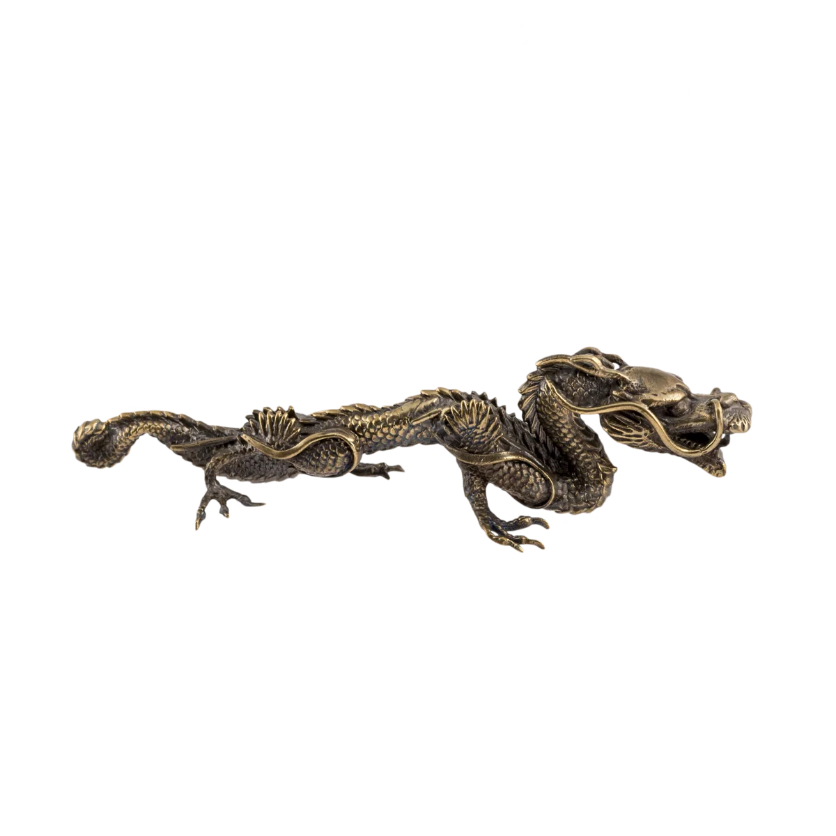 Мастерская «Калежа» изготавливает статуэтки, изображающие мифических животных. Дракон китайский создан из латуни – для этого использовалось художественное литье. Чтобы получить необходимое изображение кожи, наши специалисты применяли химическую гравировку. Изготовление уникального сувенира занимает до трех недель. Также мы работаем с эскизами, которые выполнены клиентами.