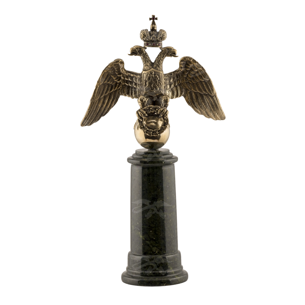 Двухглавый орел, символ России, сидит на шаре, который расположен на высокой подставке из натурального камня. В когтях он держит лавровый венок, над головами находится большая императорская корона инкрустированная камнями. На груди орла герб с изображением Георгия Победоносца. Скульптура изготовлена из латуни по технологии художественного литья. В продаже бронзовые статуэтки, по-разному изображающие орла.