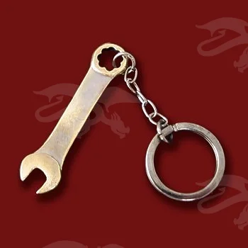 Изделие, выполненное в минималистичном стиле. Брелок в виде гаечного ключа, к одному из концов которого крепится надежная цепочка с кольцом.