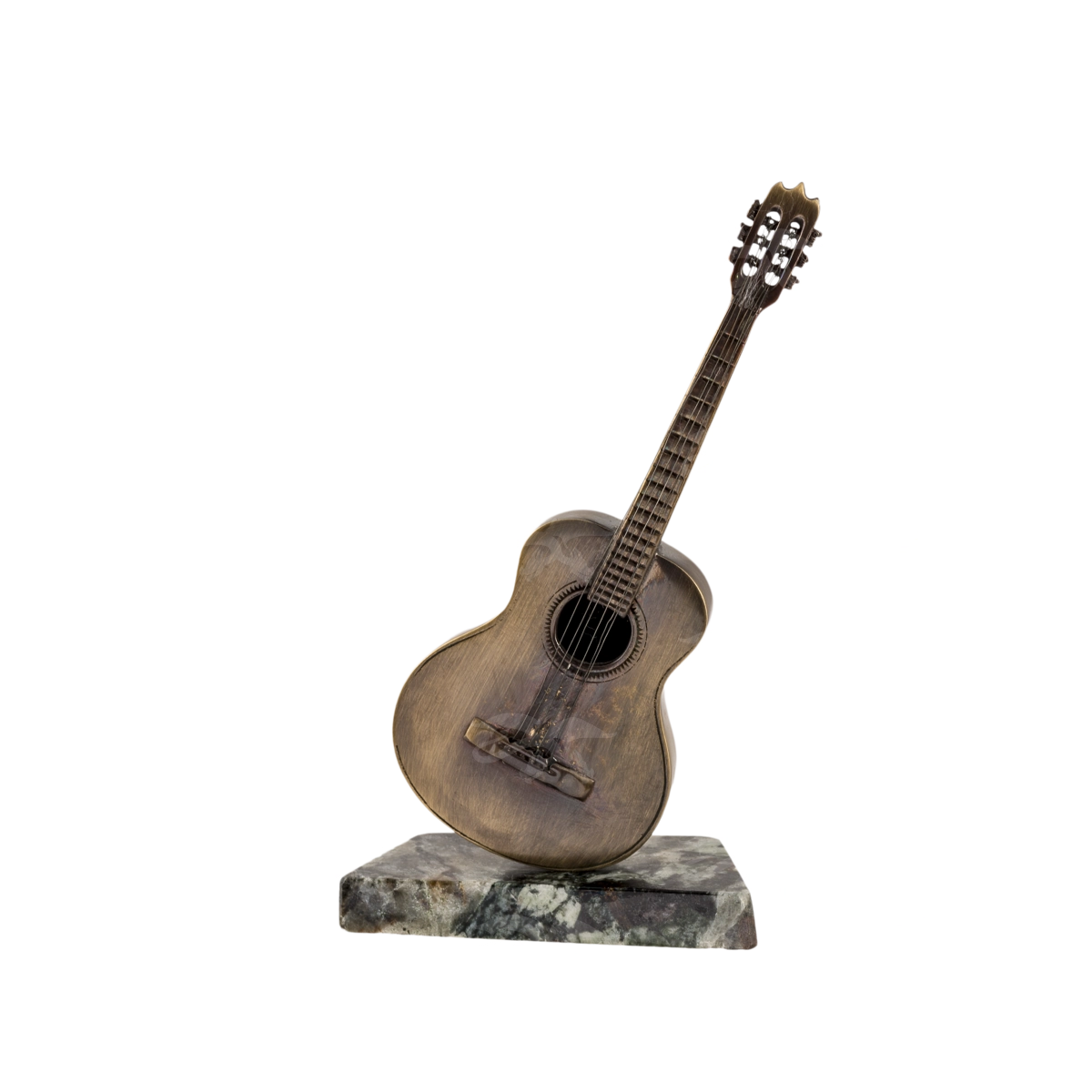 Мастерская «Калежа» изготавливает сувениры, используя латунь. Оригинальная гитара П1424а получена с помощью технологии бронзового литья и закреплена на подставке из натурального камня. Для создания эффекта потертой поверхности музыкального инструмента мастера использовали чернение. Можно добавить тонкий узор или новые детали. Работа над подобными проектами занимает три недели.
