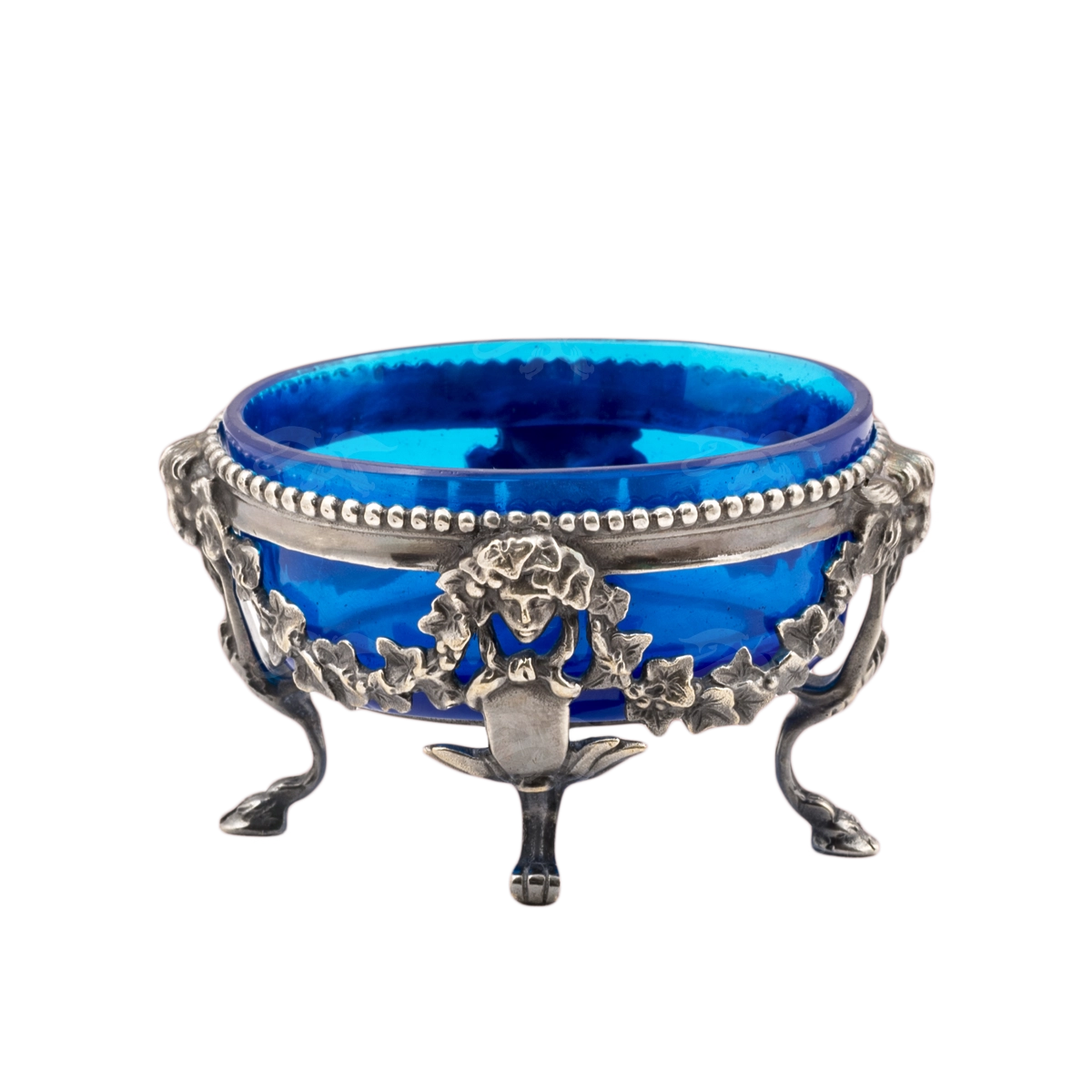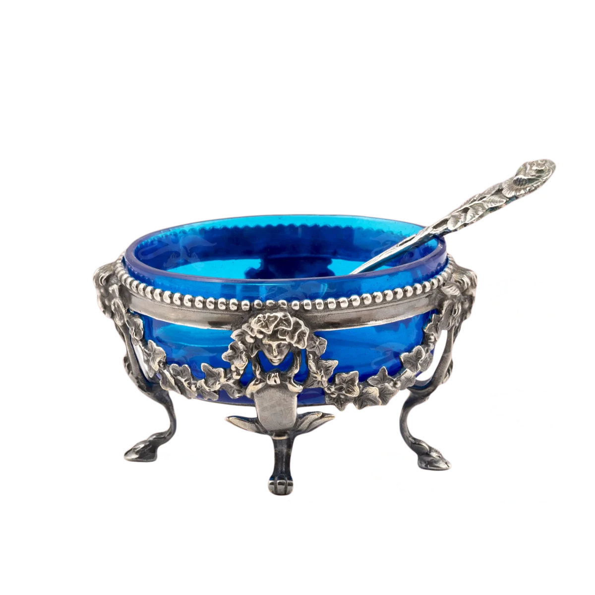 Мастерская «Калежа» изготовила элитный сувенир. Икорница выполнена по технологии «выплавления» с дальнейшей механической обработкой. Мастер проработал каждый элемент! Материалы — цветное стекло (сама чаша) в обрамлении латунного узорчатого каркаса с серебрением. Применено патинирование. Цвет сосуда художник сделал голубым для контраста с каркасом. Этот аксессуар был заказан онлайн. На изготовление ушло около трех недель.