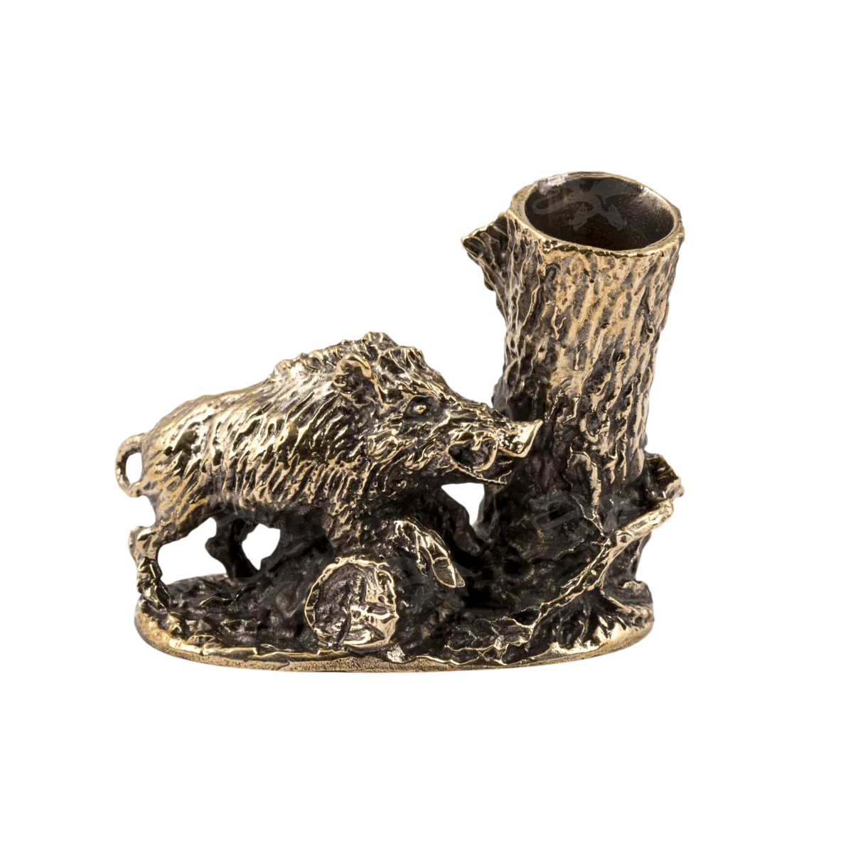 Мастерская «Калежа» выполняет оригинальные офисные аксессуары из латуни. Образцом для них может быть кабан-карандашница, созданный благодаря использованию бронзового литья. Чтобы получить реалистичное изображение шерсти, бивней и ствола дерева, мы применяли химическую гравировку. Уникальный сувенир можно вручить любителю живой природы или коллекционеру латунных фигурок. Работа над подобным проектом занимает всего три недели.