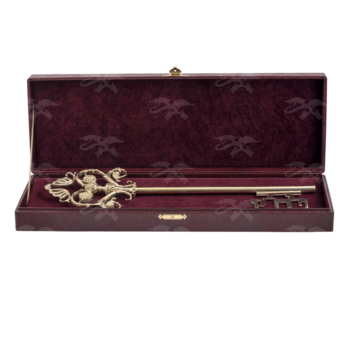 Дизайнерский ключ для торжественных мероприятий от мастерской «Калежа» изготовлен с использованием технологии латунного литья. Этот метод мастера используют, когда важен каждый штрих. Абсолютная точность — вот главная черта этого изделия. Художник воспроизвел сложные детали узоров, а поверхность сделал глянцевой. В комплекте к «золотому ключику» поставляется подарочная упаковка с подушкой из бархата.