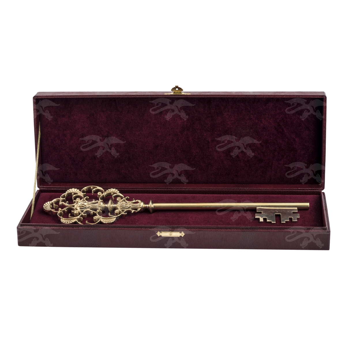 Символический ключ — неизменный элемент в мероприятиях по открытию объектов или на подписании партнерских договоров. Представленный сувенир является выставочным образцом, поэтому нет корпоративной символики и логотипов. Латунное литье и ювелирная обработка позволили мастеру воплотить эскиз высокой сложности (обратите внимание на орнамент головки ключа). Футляр с бархатной подушкой идет в комплекте.