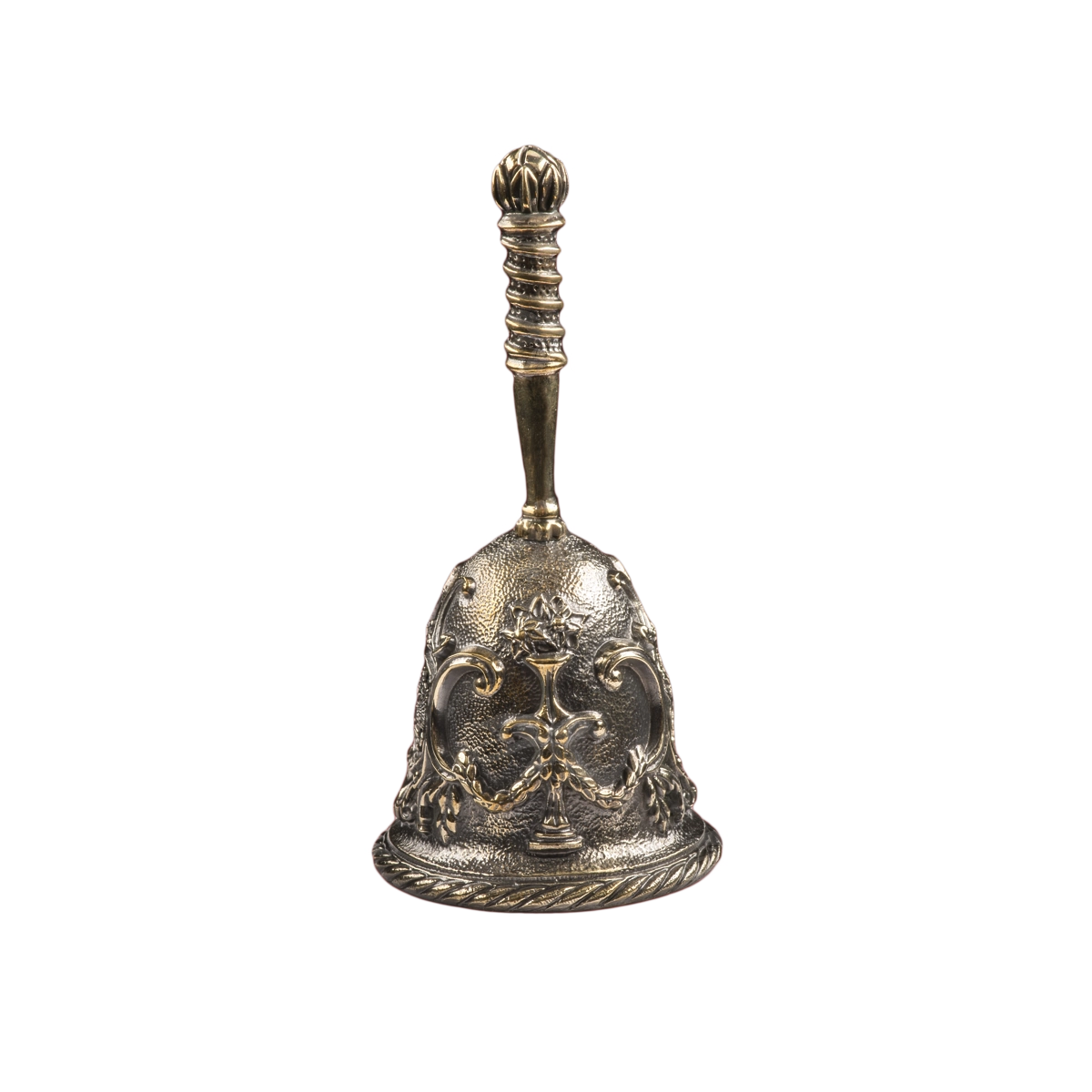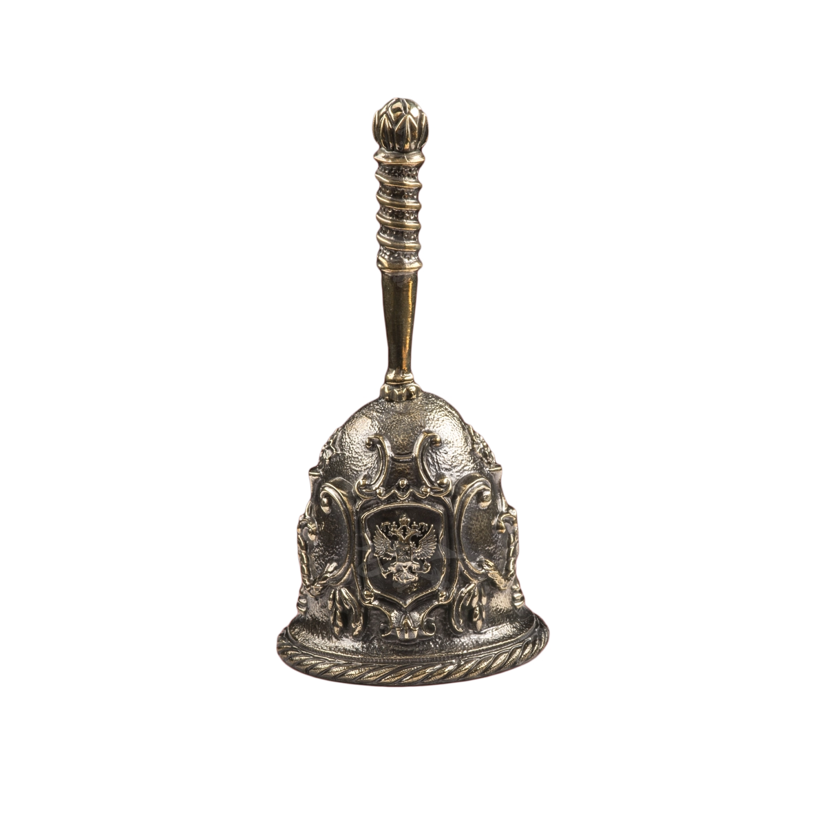 Колокольчик П1609 можно вручить сотруднику любого государственного учреждения. Универсальный подарок снабжен геральдической символикой – изображениями российского герба. Для получения рисунка мастера использовали бронзовое литье из латуни. При оформлении уникального аксессуара применялась химическая гравировка и чернение. Мастерская «Калежа» создает сувениры в подобном стиле – работа наших специалистов занимает до трех недель.