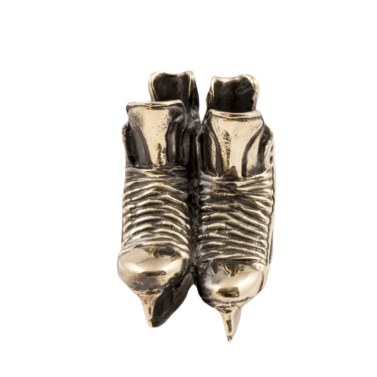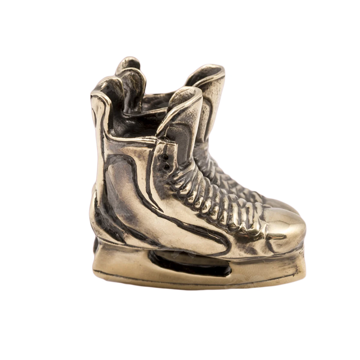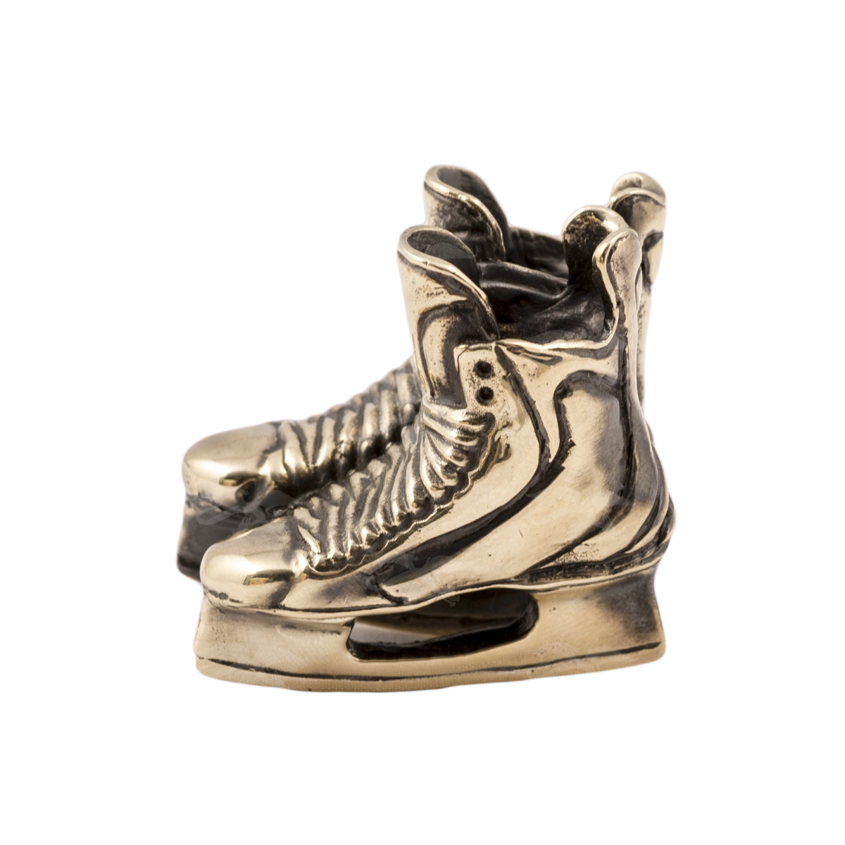 Художественно-производственная мастерская «Калежа» занимается изготовлением различной сувенирной продукции. Коньки хоккейные выполнены из латуни. Чтобы получить сложную форму, мастера использовали бронзовое литье. Благодаря такой технологии на изделии четко видны все элементы: лезвия и шнурки. Наши специалисты создают подобные композиции за три недели.