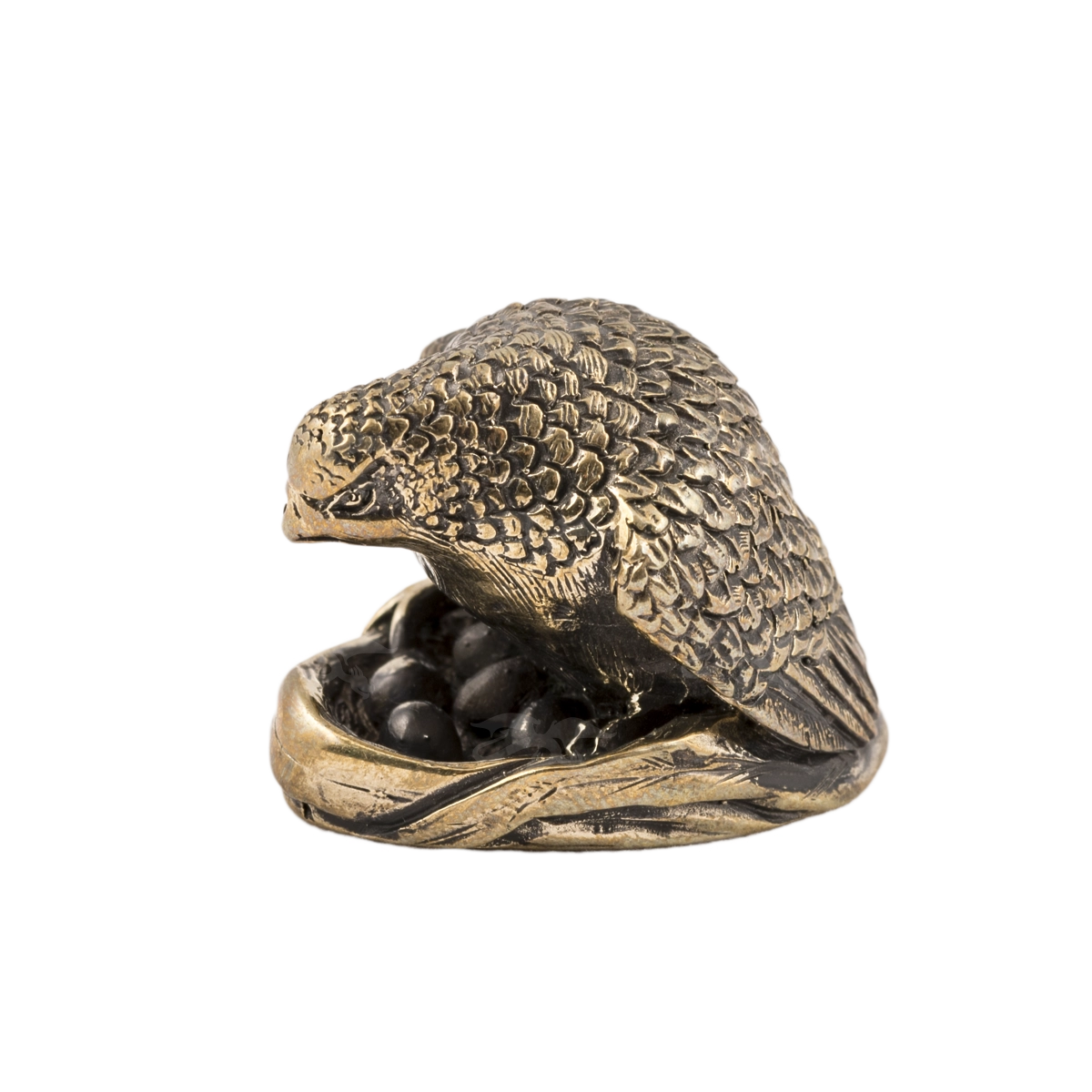 Мастерская «Калежа» выполняет уникальные фигурки птиц из латуни. Образцом может стать куропатка, созданная по технологии бронзового литья. Для получения реалистичного изображения птичьих перьев мы использовали химическую гравировку и чернение. Оригинальный подарок можно вручить охотнику или коллекционеру латунных статуэток. Срок работы над подобным проектом составляет три недели.