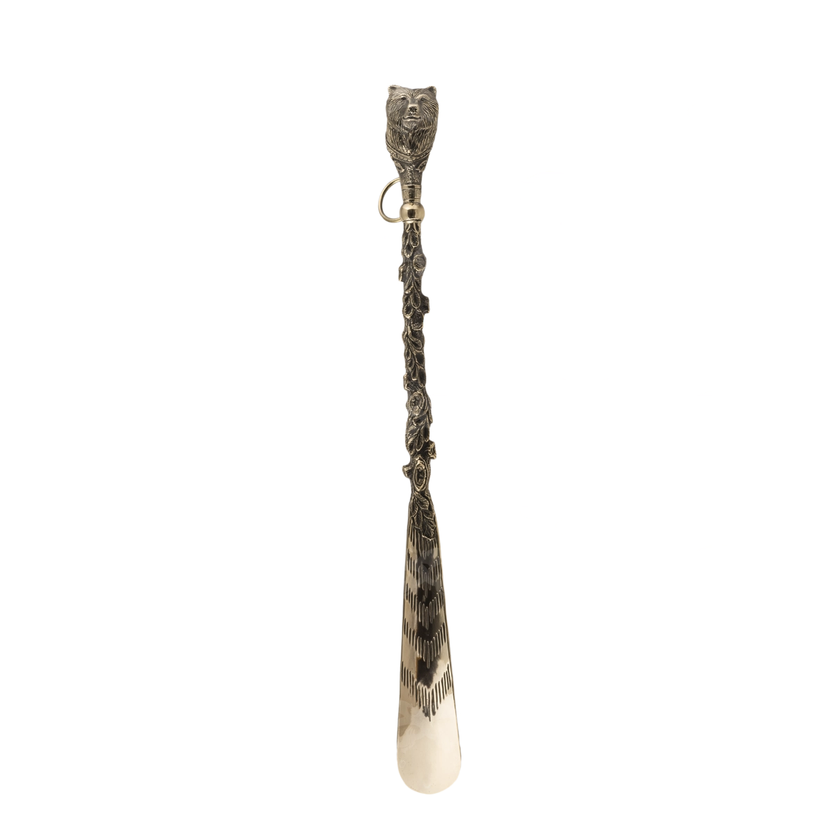 Мастерская «Калежа» изготовила оригинальную ложку для обуви с головой медведя. Основной технологией производства стало бронзовое литье из латуни. Для оформления объемных деталей мы применяли чернение и гравировку. Создание подобной работы занимает три недели. Также вы можете заказать изготовление сувениров по собственным эскизам.