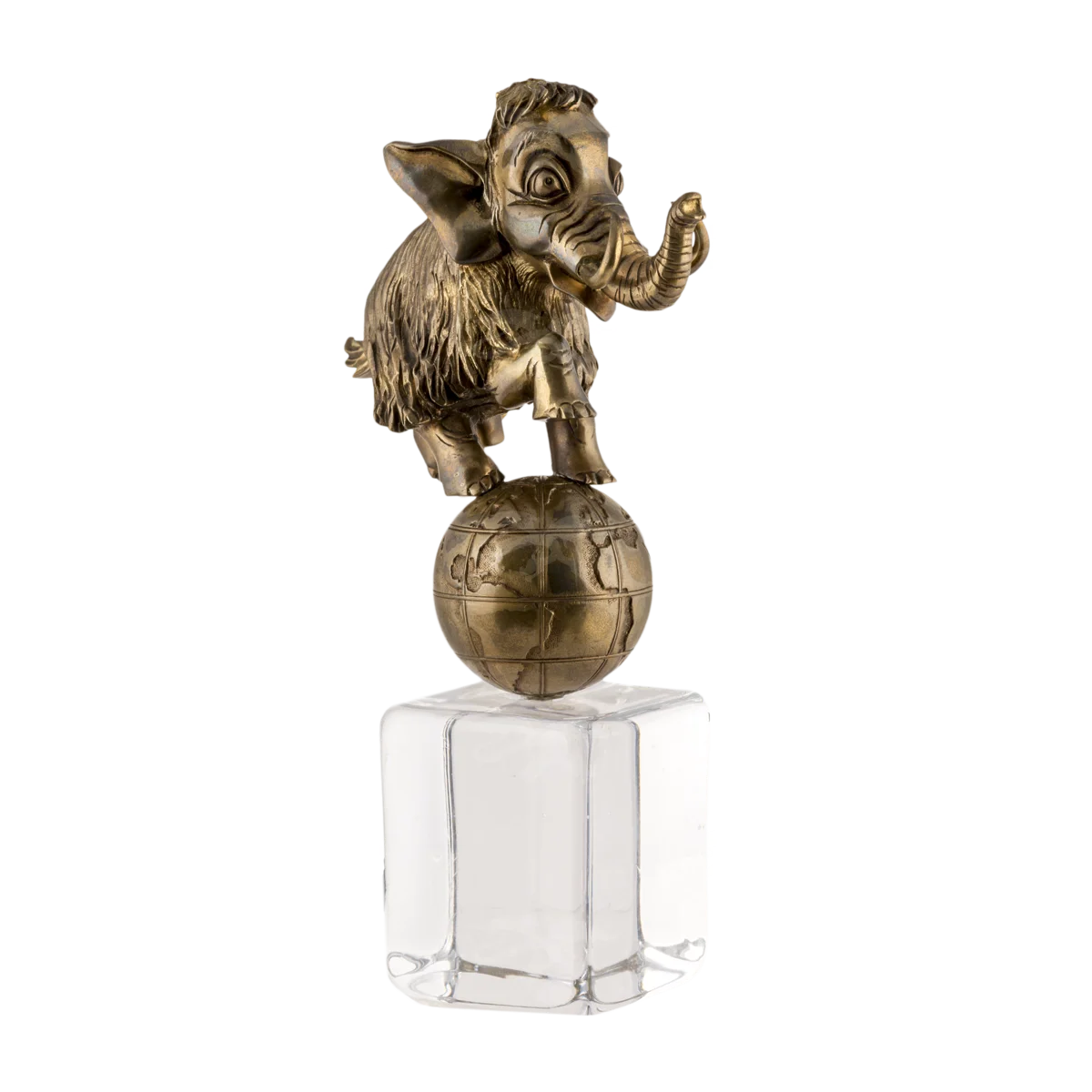 Мастерская «Калежа» создает статуэтки животных. Уникальный мамонтёнок на шаре П436 выполнен при помощи бронзового литья. Чтобы получить рельефное изображение шерсти на латунной поверхности, наши мастера использовали чернение. Фигурка закреплена на постаменте из оптического стекла. Также можно добавить в оформление другие декоративные элементы. Работа над таким же заказом ведется около трех недель.