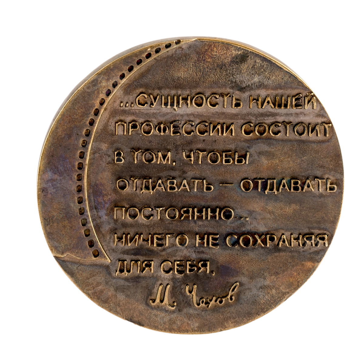 Мастерская «Калежа» выполняет медали на заказ. Основной материал для их изготовления – латунь. Эта награда посвящена известному театральному деятелю Михаилу Чехову. Призы с подобным оформлением можно снабжать персонифицированными элементами. На поверхность наносят оригинальные рисунки или надписи. Для этого мастера используют гравировку. Сувенирную продукцию изготавливают минимум за три недели. Возможна работа с эскизами, которые предоставляет заказчик.