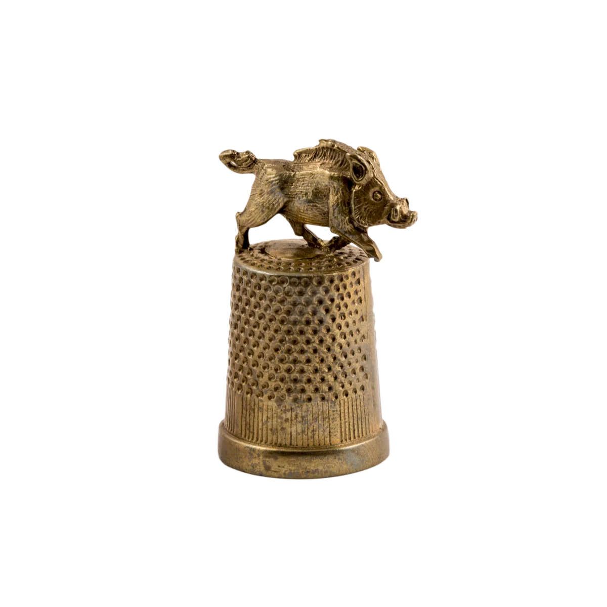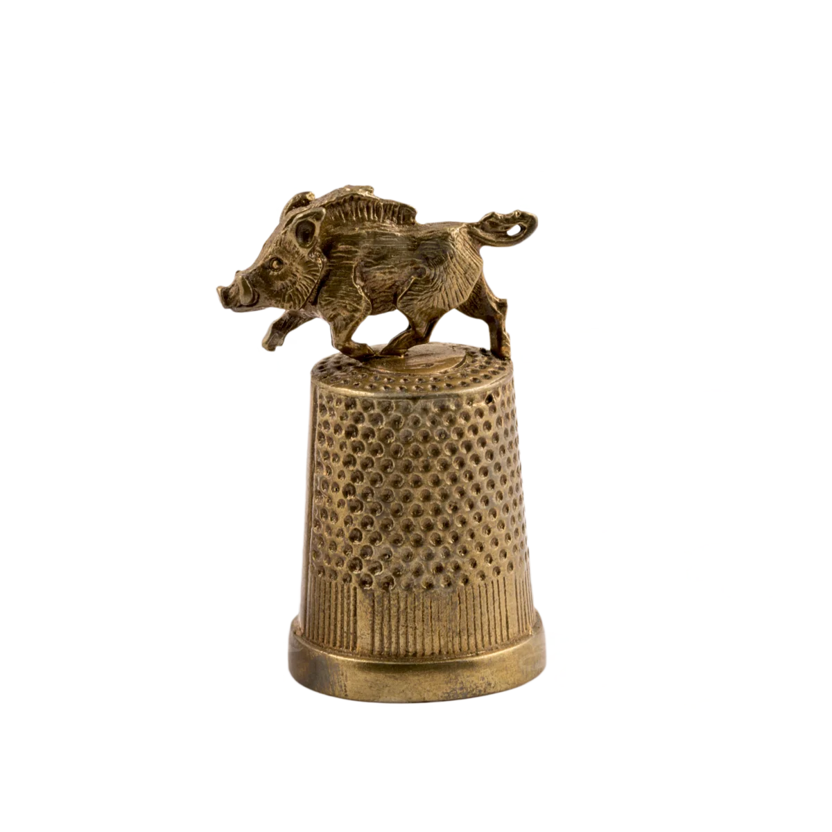 Мастерская «Калежа» изготавливает оригинальные миниатюрные подарки из латуни. Наперсток «Кабан» может служить образцом для подобных работ. Защитный колпачок с изображением животного на вершине выполнен по технологии бронзового литья. Можно использовать новые детали или выбрать другого зверя. Создание таких сувениров для охотников занимает до трех недель.
