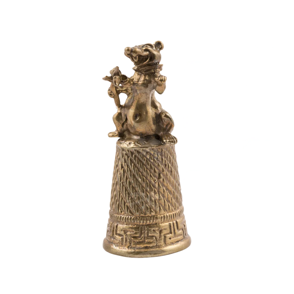 Мастерская «Калежа» создает коллекционные сувениры из латуни. Наперсток «Крыса» изготовлен с помощью бронзового литья. На вершине защитного колпачка можно увидеть улыбающегося забавного зверька. Чтобы получить необходимый рельеф, мы использовали технологии гравировки. Для миниатюрного подарка можно выбрать изображение любого животного. Он будет выполнен в течение трех недель.