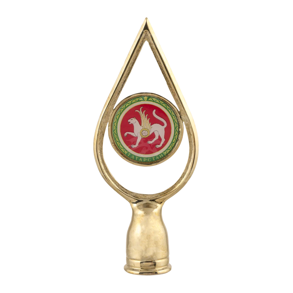Мастерская «Калежа» создает уникальные аксессуары для государственных учреждений. Навершие с гербом Татарстана из латуни изготовлено по технологии бронзового литья. Центральный декоративный элемент – официальная символика республики. Изображение крылатого барса в круглом щите нанесено методом УФ-печати. Срок выполнения заказа нашими мастерами составляет не более трех недель.