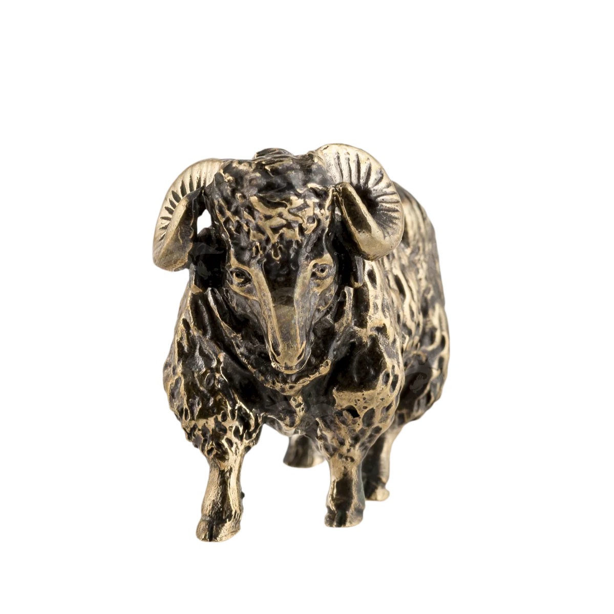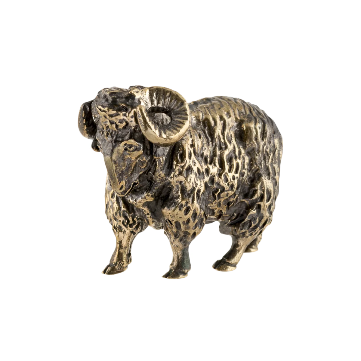 Статуэтка в виде овцы, которая остановилась и хитро смотрит на зрителя исподлобья, выполнена из полированной латуни. Композиция гармонично дополнена основанием из камня.