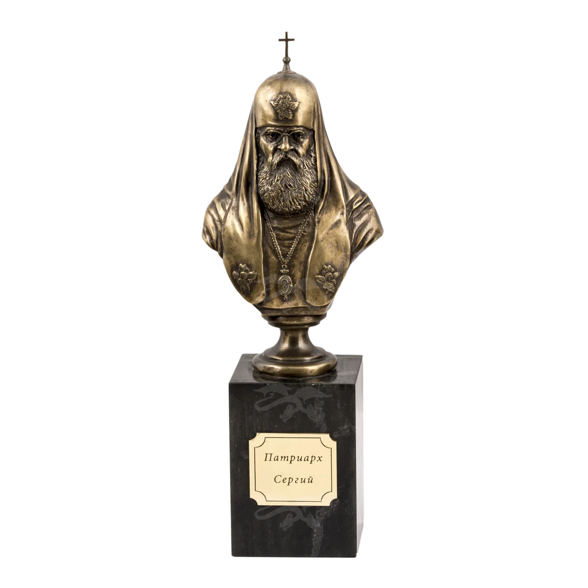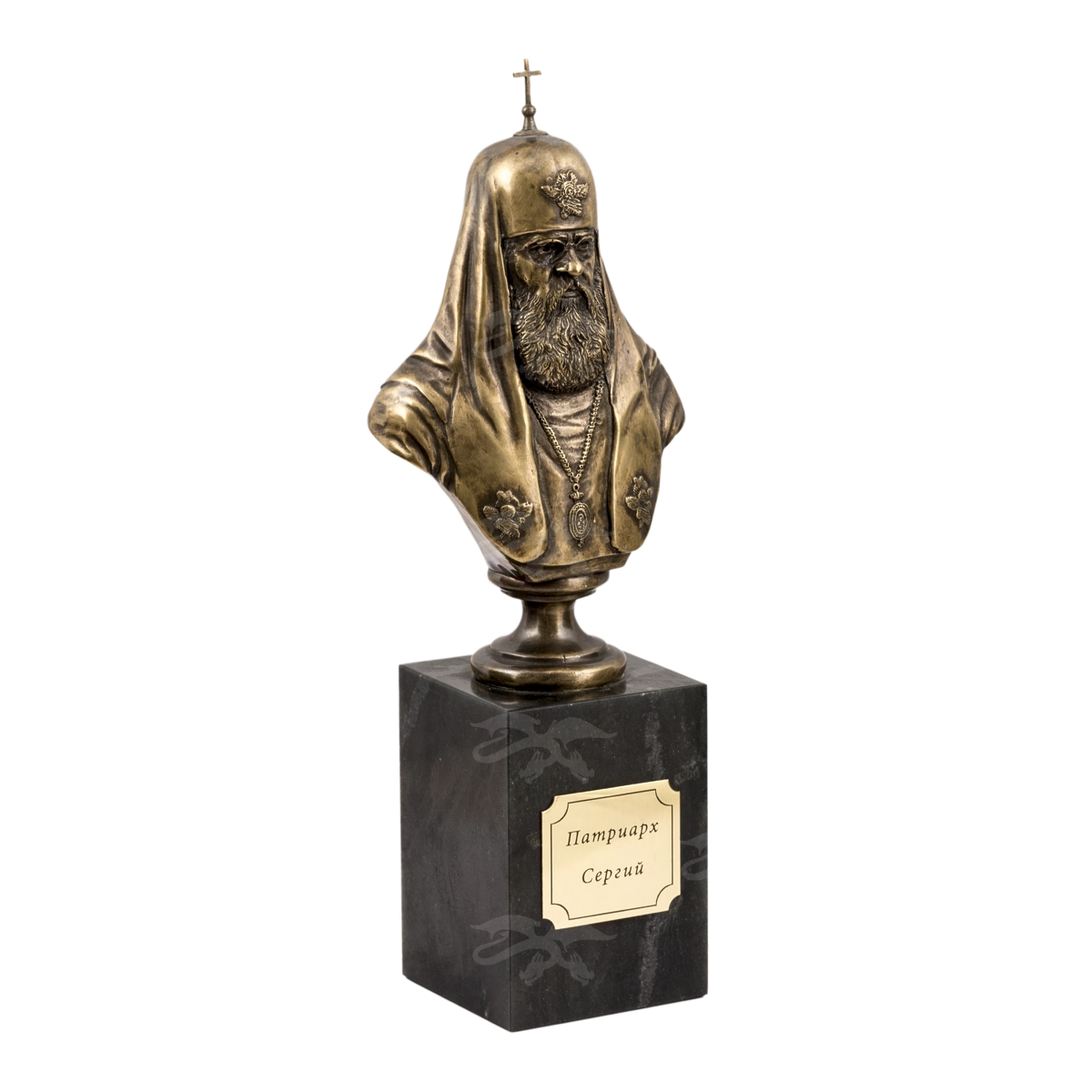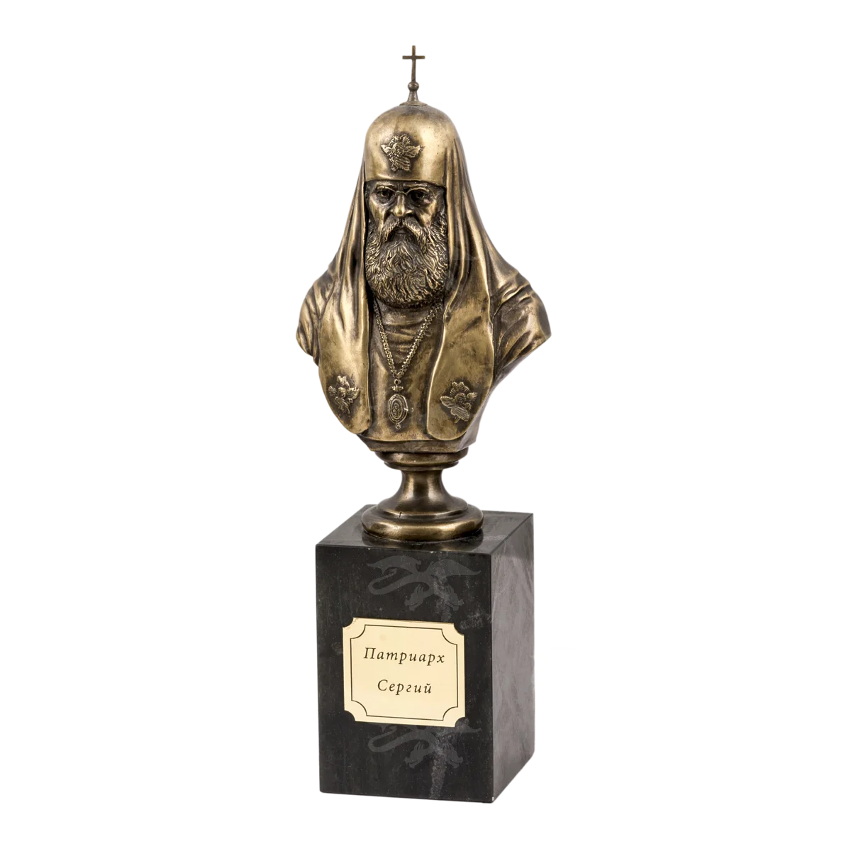 Бюст Патриарха Всея Руси Сергия из латуни. Технология: художественное литье по образцу бронзового. Основание — натуральный камень. Мастер вначале изготовил скульптуру из пластичного материала, по которой сделал форму для отливки. После расплавленный металл был залит в литник. Полученная заготовка обрабатывалась до совершенства. В мастерской «Калежа» принято добиваться полного портретного сходства с оригиналом.