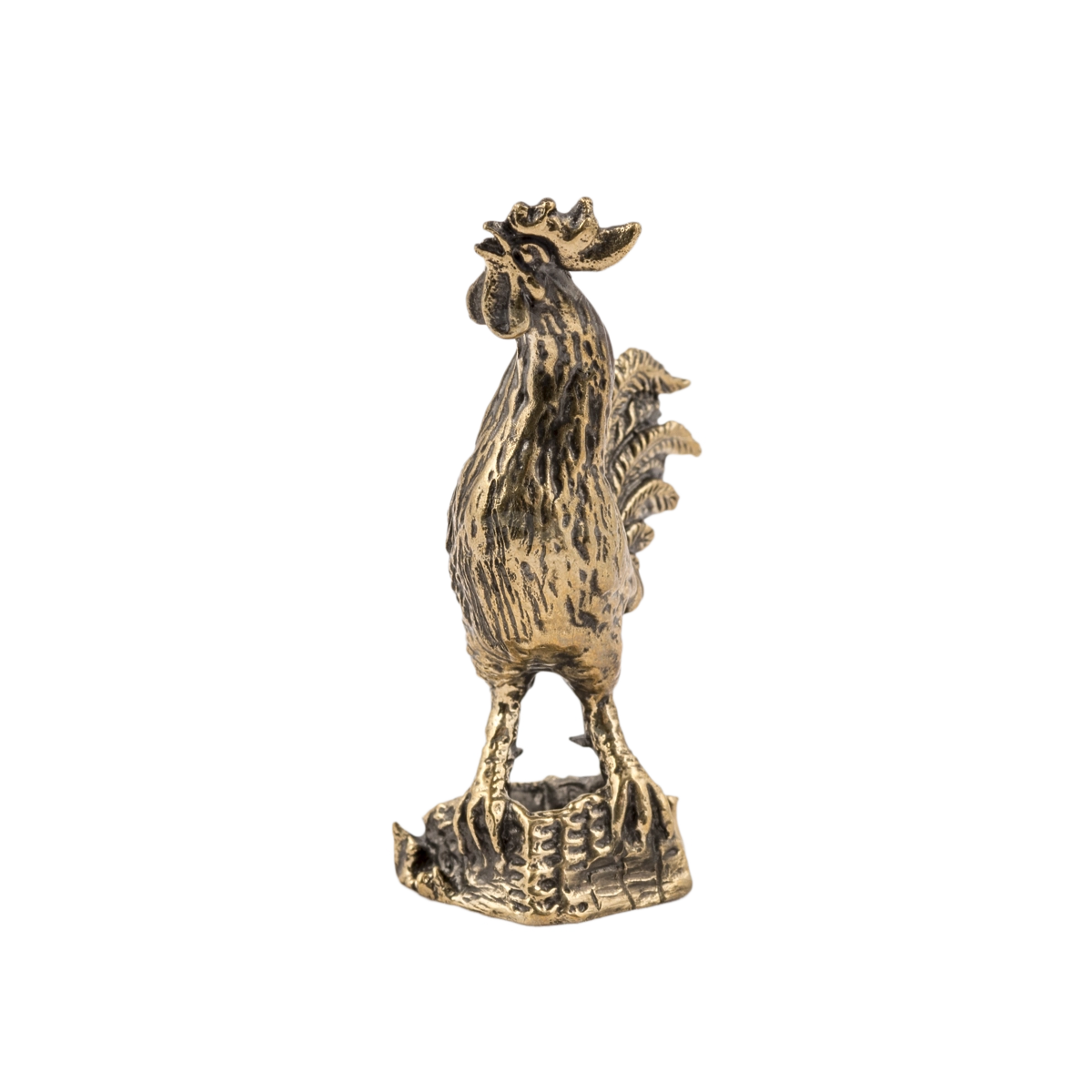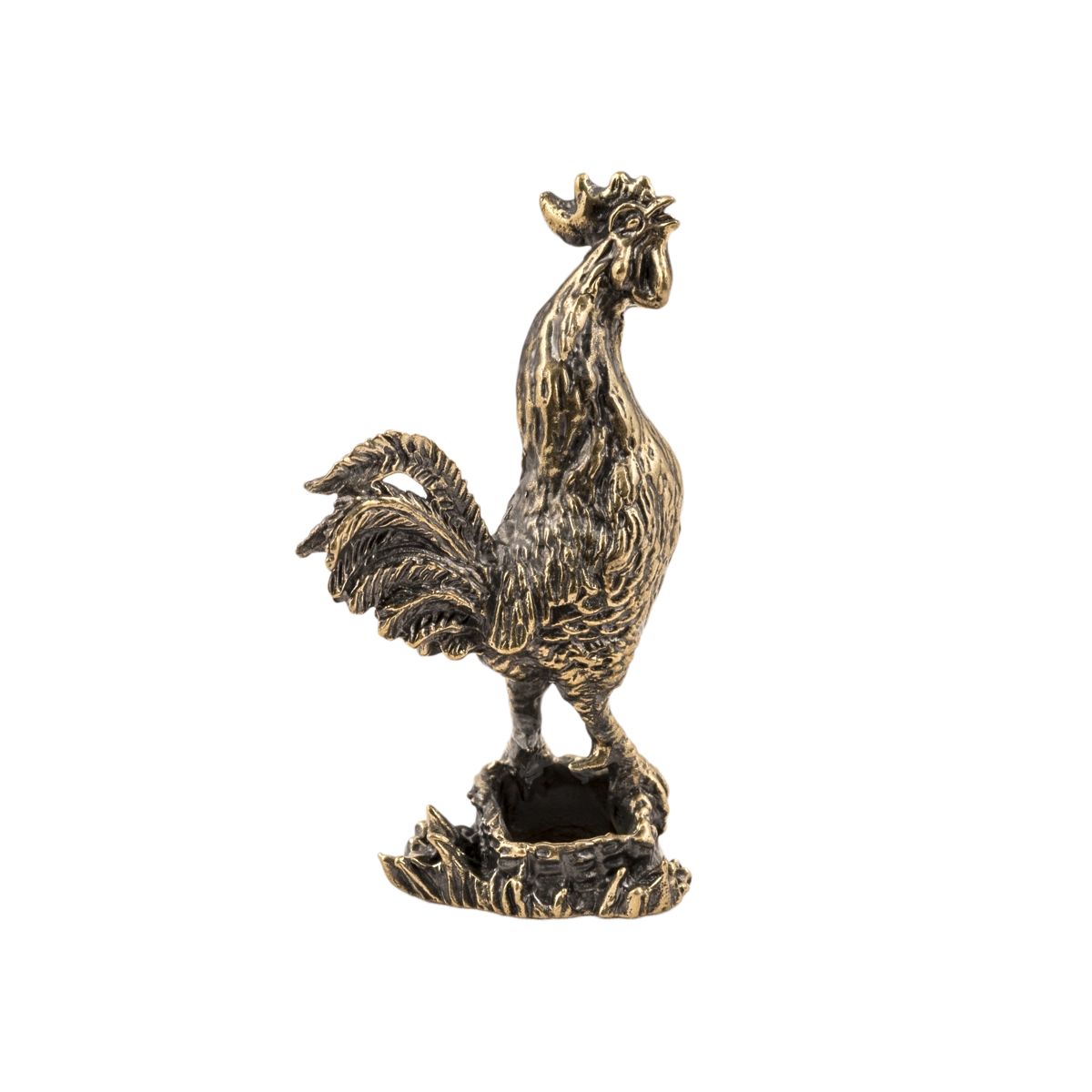 Мастерская «Калежа» создает оригинальные статуэтки птиц. Петух на корзинке – образец для подобных работ. Такой сувенир можно вручить не только коллекционеру, но и работнику сельского хозяйства. Чтобы получить фигурку кукарекающего петуха, наши специалисты использовали латунь и бронзовое литье. Для создания реалистичного объемного изображения применялось чернение. Выполнение заказа занимает всего три недели.