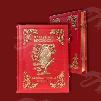 Элитные сувениры – разумное дополнение к важной встрече или официальному приему. Сборник русских пословиц «Народная мудрость» – оригинальное решение, которое оценит остроумный человек. Книга в изысканном переплете алого цвета, снабженная бронзовыми накладками, может стать дорогим подарком для руководителя или ключевого партнера. Использование вензелей одинаково уместно на деловом обеде и юбилейном торжестве.