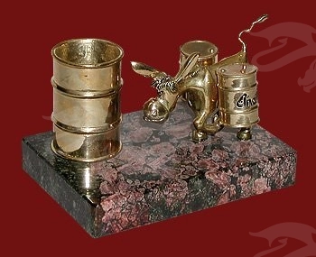 Оригинальный сувенир изображает трудолюбивого ослика, который несет свою увесистую ношу к большому бочонку. Все детали тщательно проработаны и выполнены в золотых тонах. Статуэтка расположена на двухцветной мраморной подставке. VIP-подарки для солидных людей, изготавливаемые мастерской «Калежа», доставят радость как коллегам, так и партнерам по бизнесу. Данное изделие может быть адаптировано для организаций, работающих в самых разных сферах.