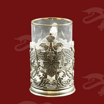 Бронзовый подстаканник с изображение герба Министерства обороны выполнен методом художественного литья. В центре изделия – герб (двуглавый орел со щитом). По периферии – сложный растительный узор. Корпоративные подарки, выполненные мастерами «Калежа» – это уникальные изделия с эксклюзивным дизайном. По желанию клиента в эскиз могут быть внесены элементы изделий, представленных в качестве выставочных образцов, в том числе и данного подстаканника.
