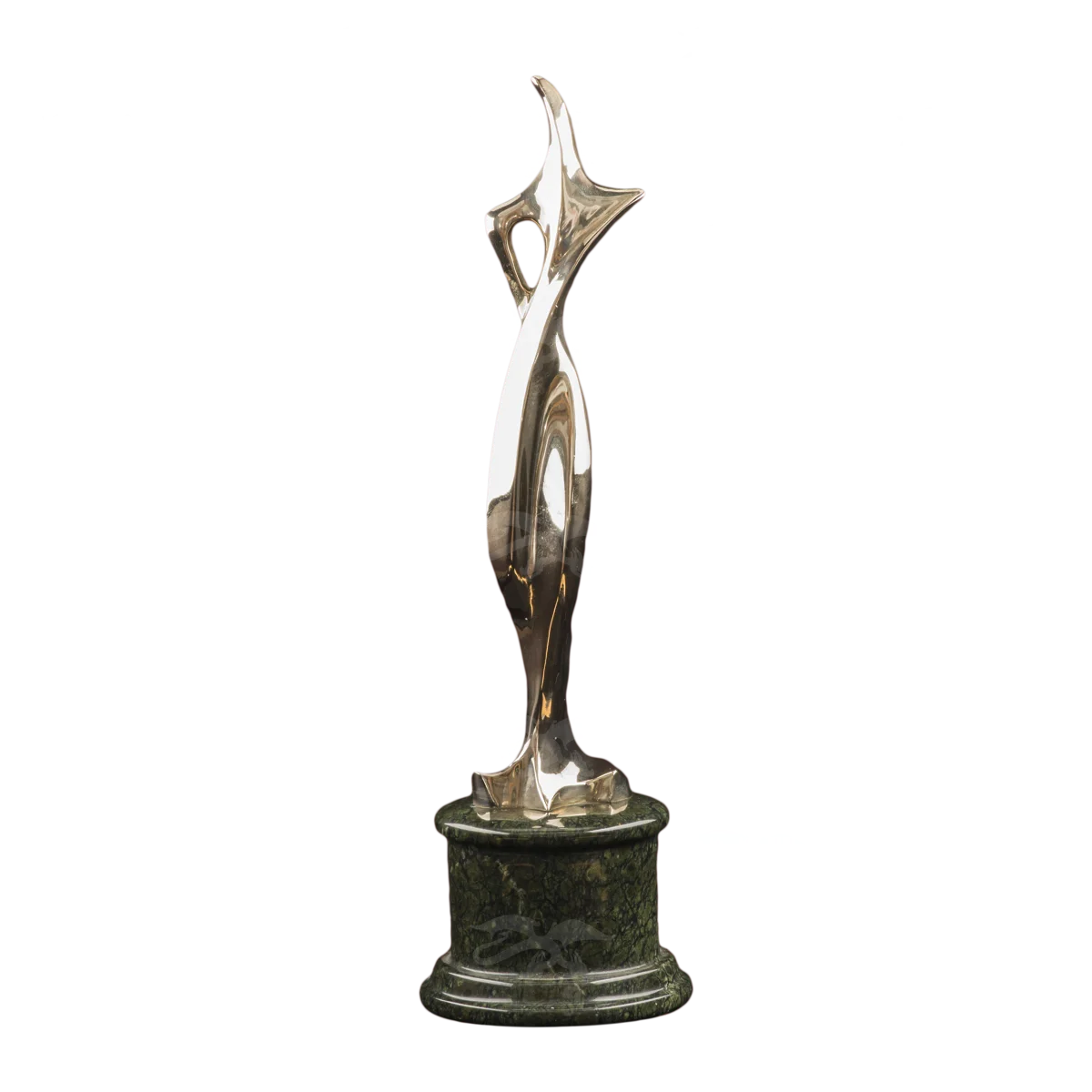 Мастерская «Калежа» изготавливает оригинальные подарочные статуэтки из латуни. Приз «Экзерсис» – уникальная работа наших специалистов, созданная для победителя танцевального конкурса. В центре композиции – абстрактная фигура, полученная с помощью технологии бронзового литья. Она закреплена на основании из камня. Сувенир можно дополнить новыми декоративными элементами или надписями. Изготовление подобной награды занимает до трех недель.