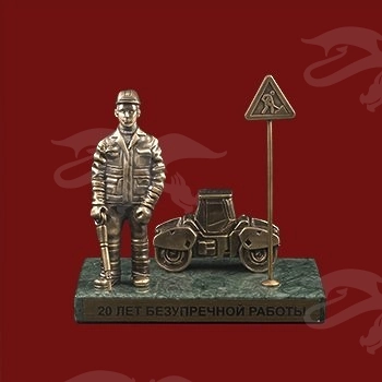 Статуэтка из бронзы имеет оригинальную форму: она выполнена в виде фигурки человека в рабочей форме. Основание композиции выполнено из мрамора и снабжено табличкой с выгравированной памятной надписью «20 лет безупречной работы». Специалисты нашей мастерской могут изготовить уникальные корпоративные подарки в подобном стиле. Вы также можете ознакомиться и с другими образцами работ в нашем каталоге.