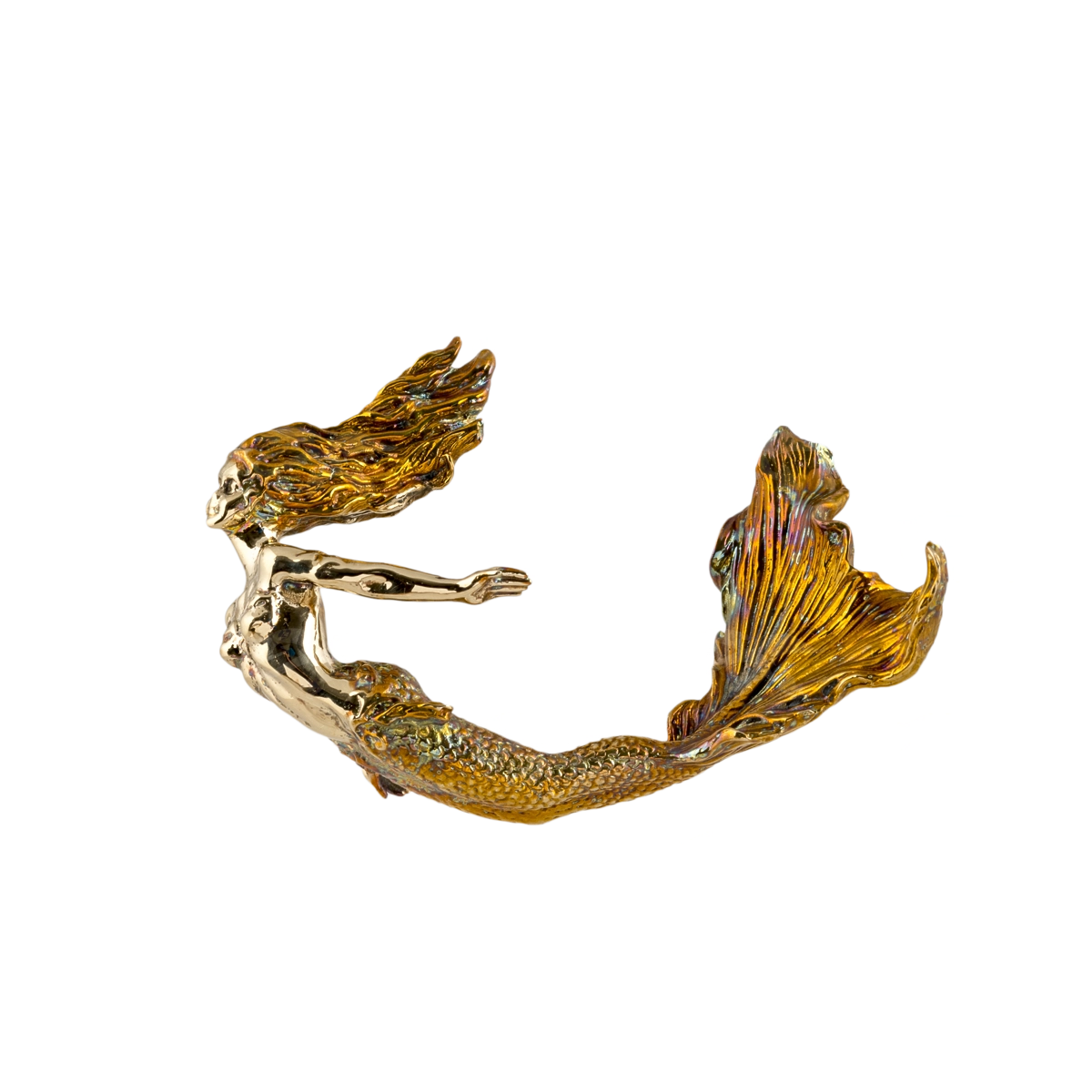 Художественно-производственная мастерская «Калежа» создает оригинальные статуэтки с мифическими или сказочными сюжетами. Русалка выполнена с помощью бронзового литья. При обработке поверхности мы применяли технологию золочения. Наши специалисты могут изменить некоторые детали или добавить в оформление уникальные элементы. Подобный заказ выполняется в течение трех недель.