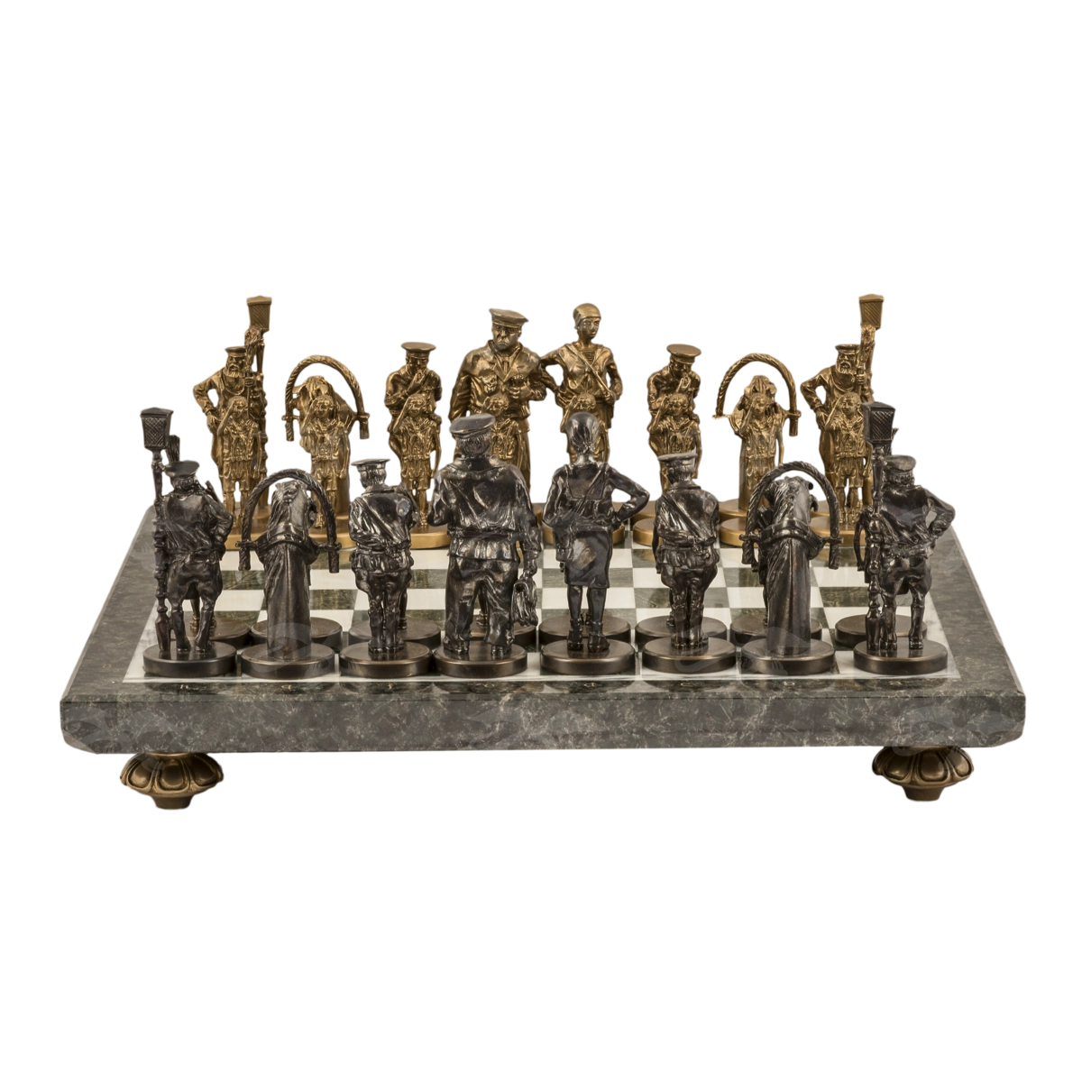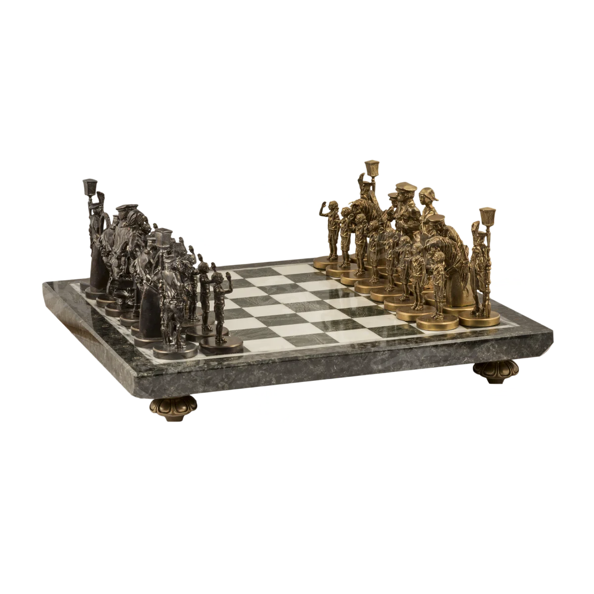 В мастерской «Калежа» можно сделать креативные подарки для любителей интеллектуального досуга. Уникальные шахматы изготовлены по технологии бронзового литья. Материалом для получения фигурок сложной формы стала латунь. Наши мастера также использовали чернение и золочение. Шахматная доска изготовлена из камня. Срок выполнения подобного заказа составляет три недели.