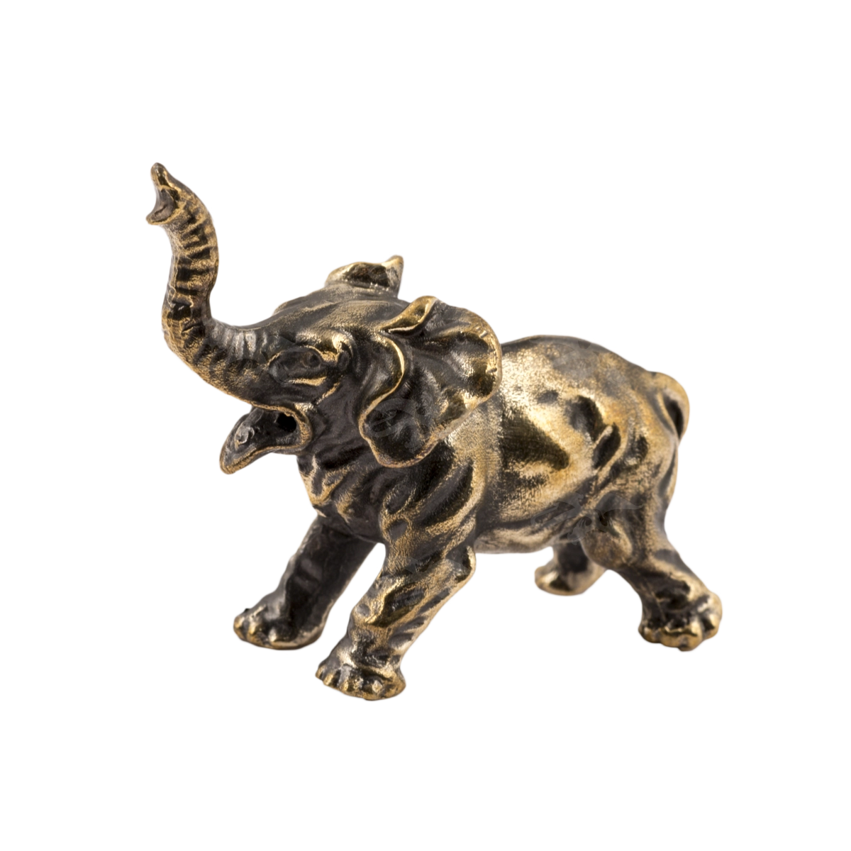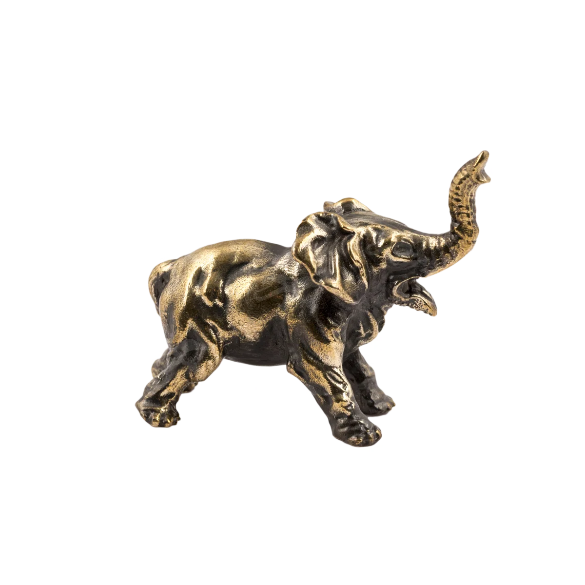 Мастерская «Калежа» изготавливает оригинальные статуэтки экзотических животных из латуни. Пример такой работы – слон с поднятым хоботом. Фигурка выполнена с помощью бронзового литья. Для создания рельефа кожи наши мастера использовали чернение. Возможен выбор другого образца для оформления или добавление новых деталей. Создание таких сувениров занимает до трех недель.