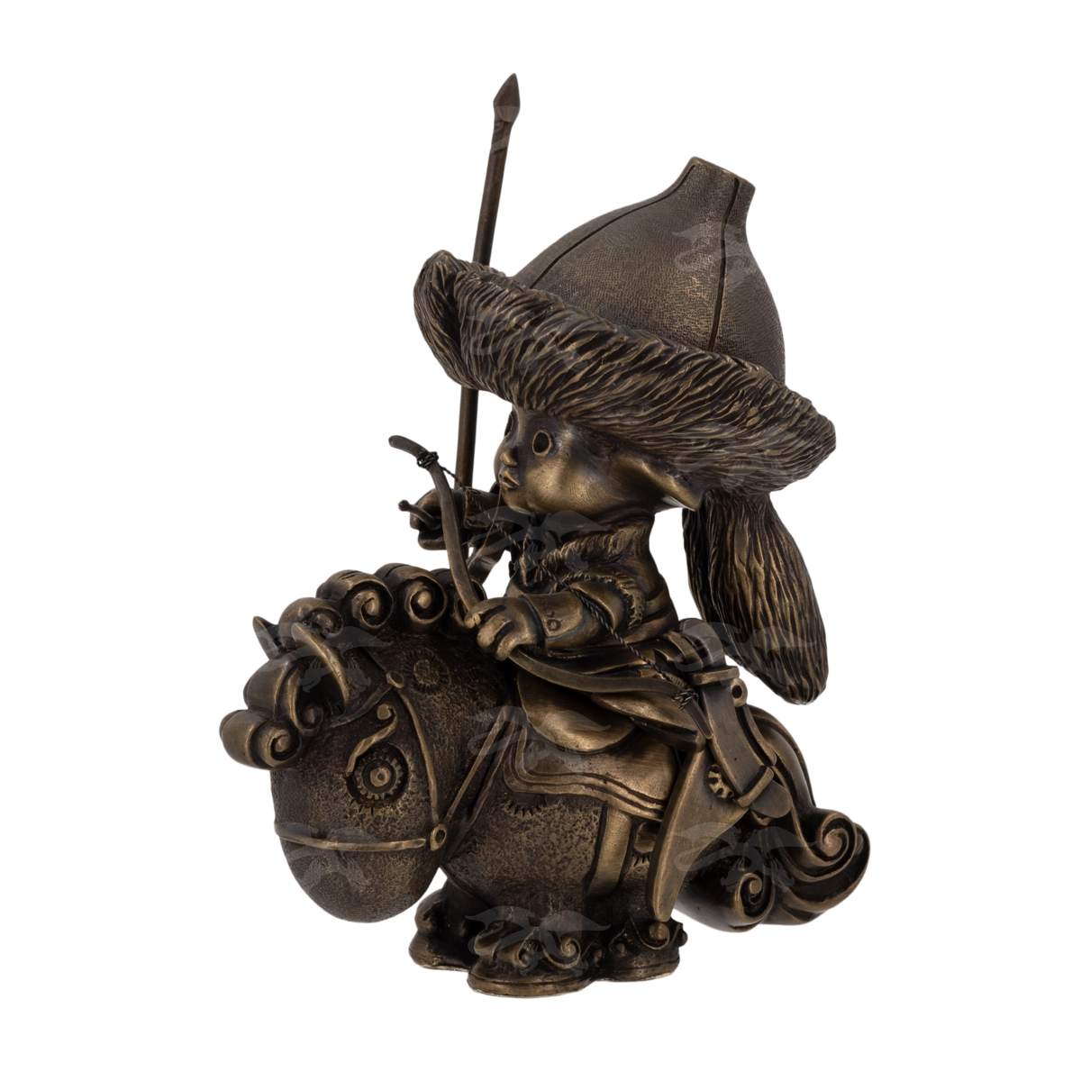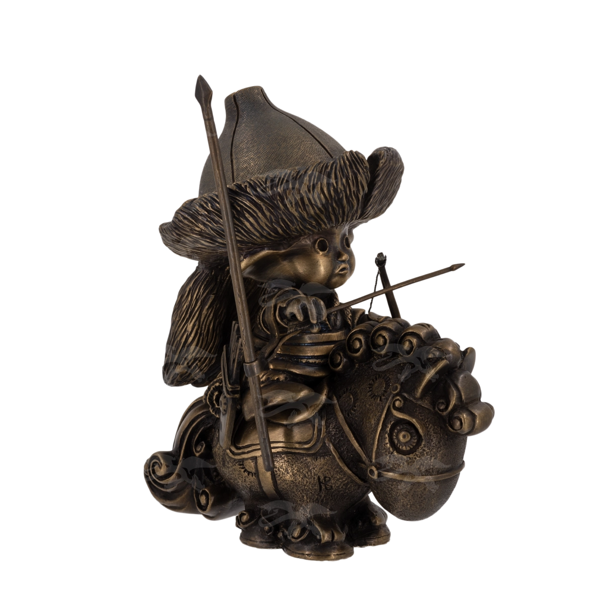 Статуэтки из бронзы производства мастерской «Калежа» отличаются тщательной прорисовкой всех деталей. Эта фигурка изображает башкирского воина времен войны 1812 года. Отряды гордых жителей степей были вооружены длинными пиками, саблями и луками. Такой подарок всегда с особым удовольствием получают жители современной Башкирии, которые помнят героическое прошлое.