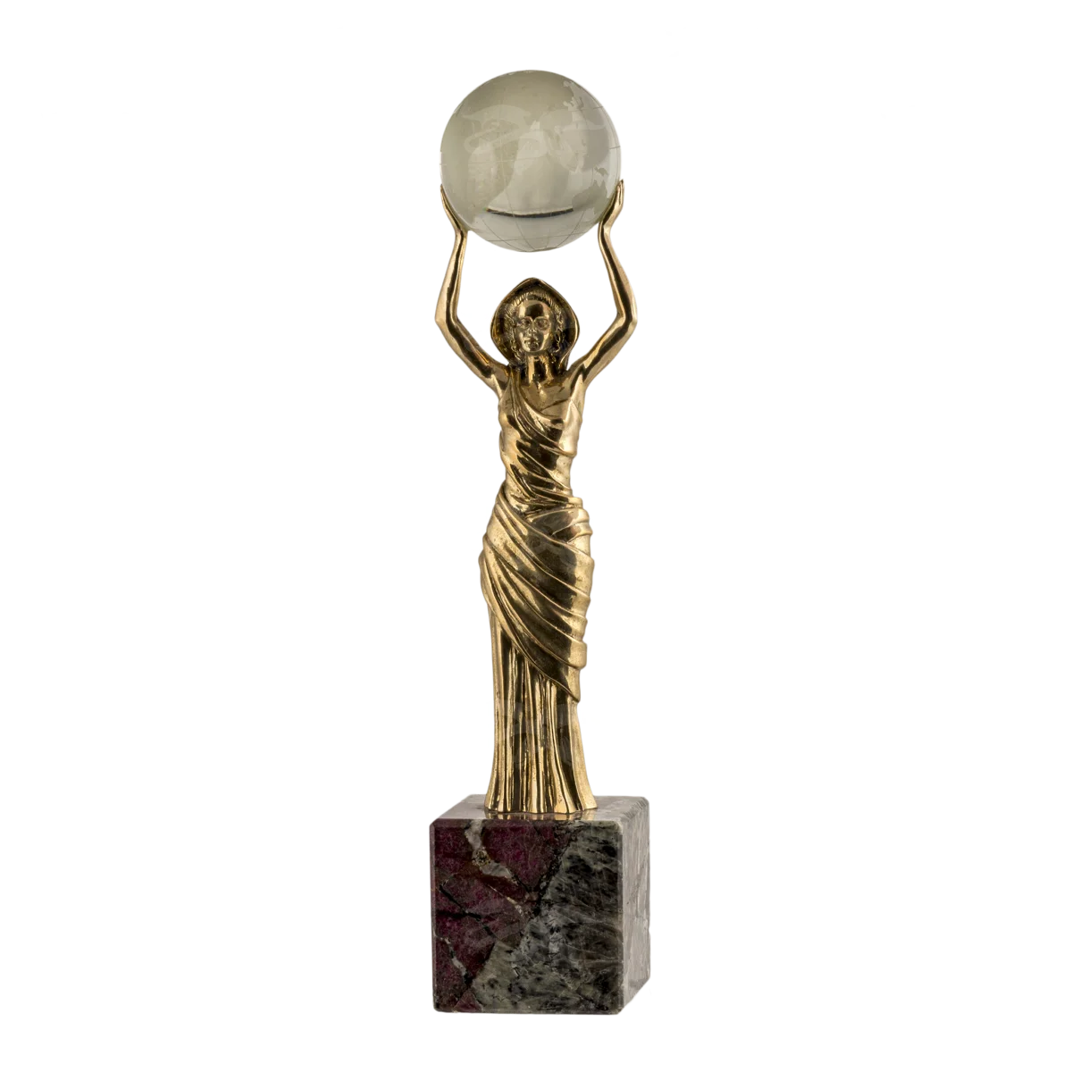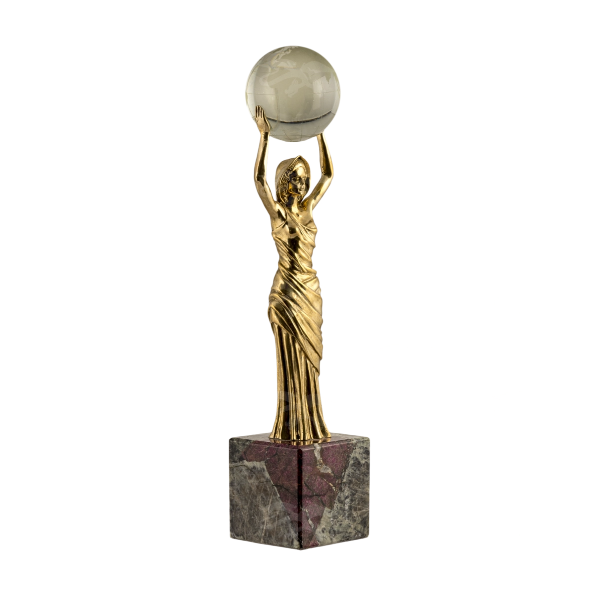 Женщина держит над головой стеклянный шар, как символ планеты.